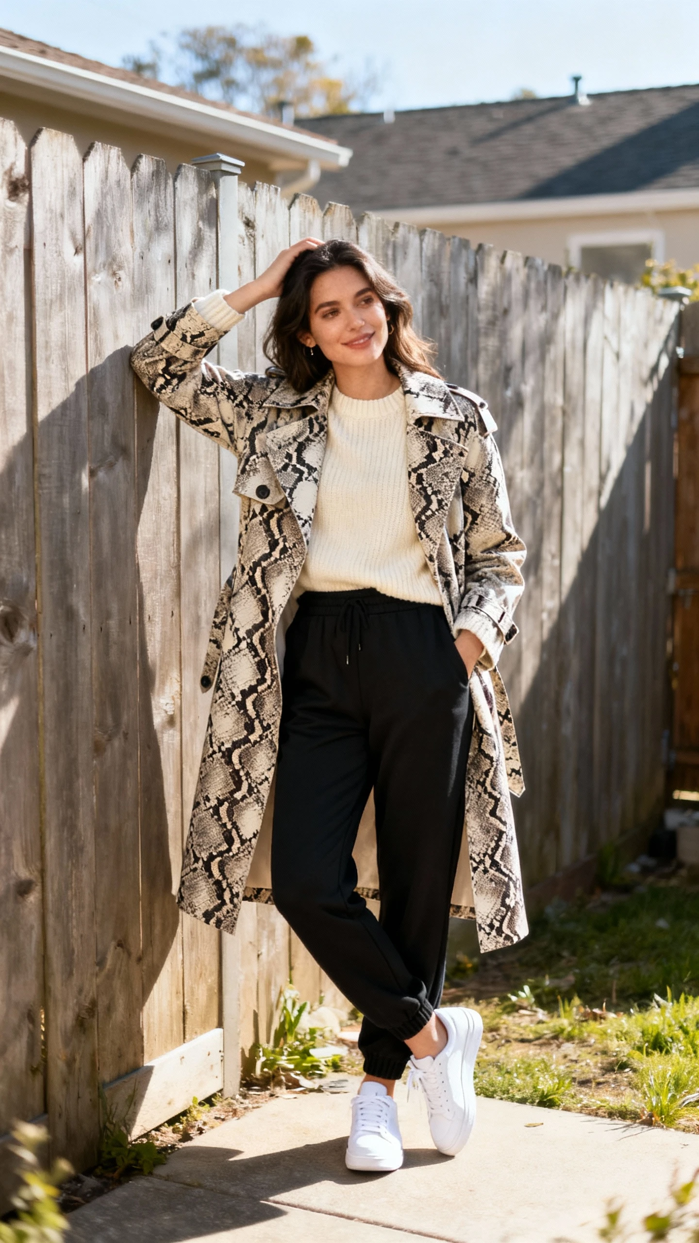 A snake-print trench is a statement piece that feels iconic. Layer it over a minimalist base and watch your entire look glow up. It’s cinematic, versatile, and never boring.