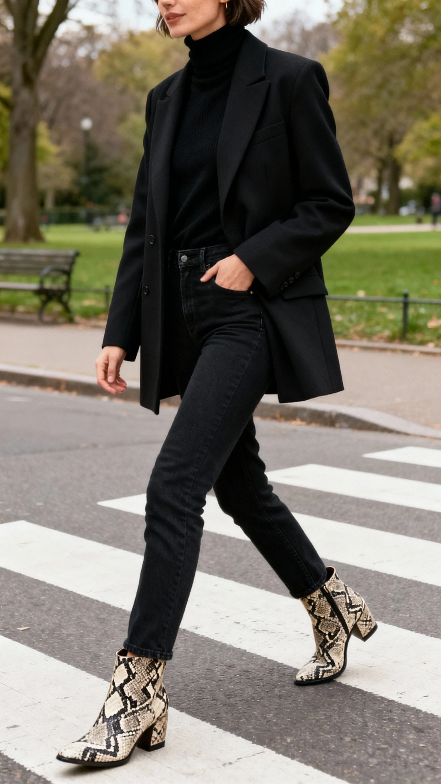 Let your snake-print boots do the talking—with a monochrome outfit that whispers “I have taste.” It’s understated until you move, then those textured boots pop in the best way.