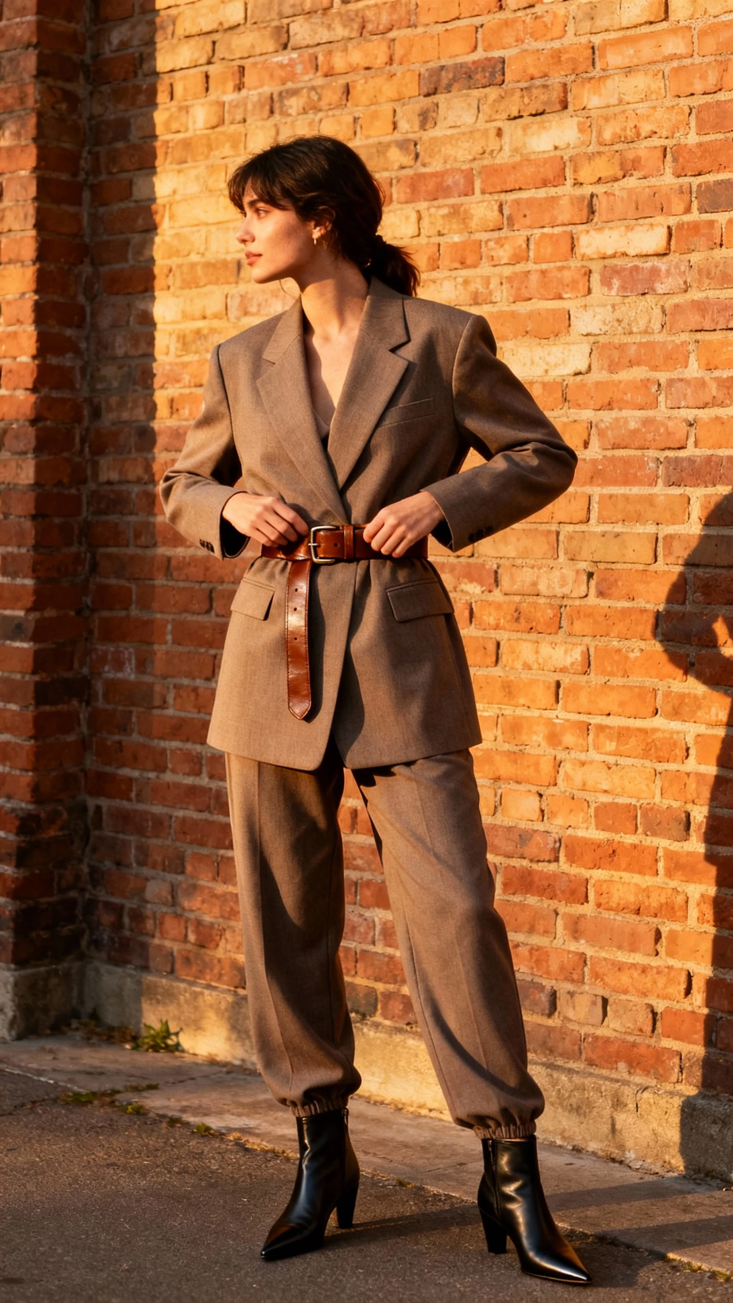 Oversize doesn’t mean shapeless. A belted baggy suit hits that high-fashion sweet spot: exaggerated volume with a cinched waist for hourglass drama. It’s editorial, flattering, and turns a hallway into your runway.