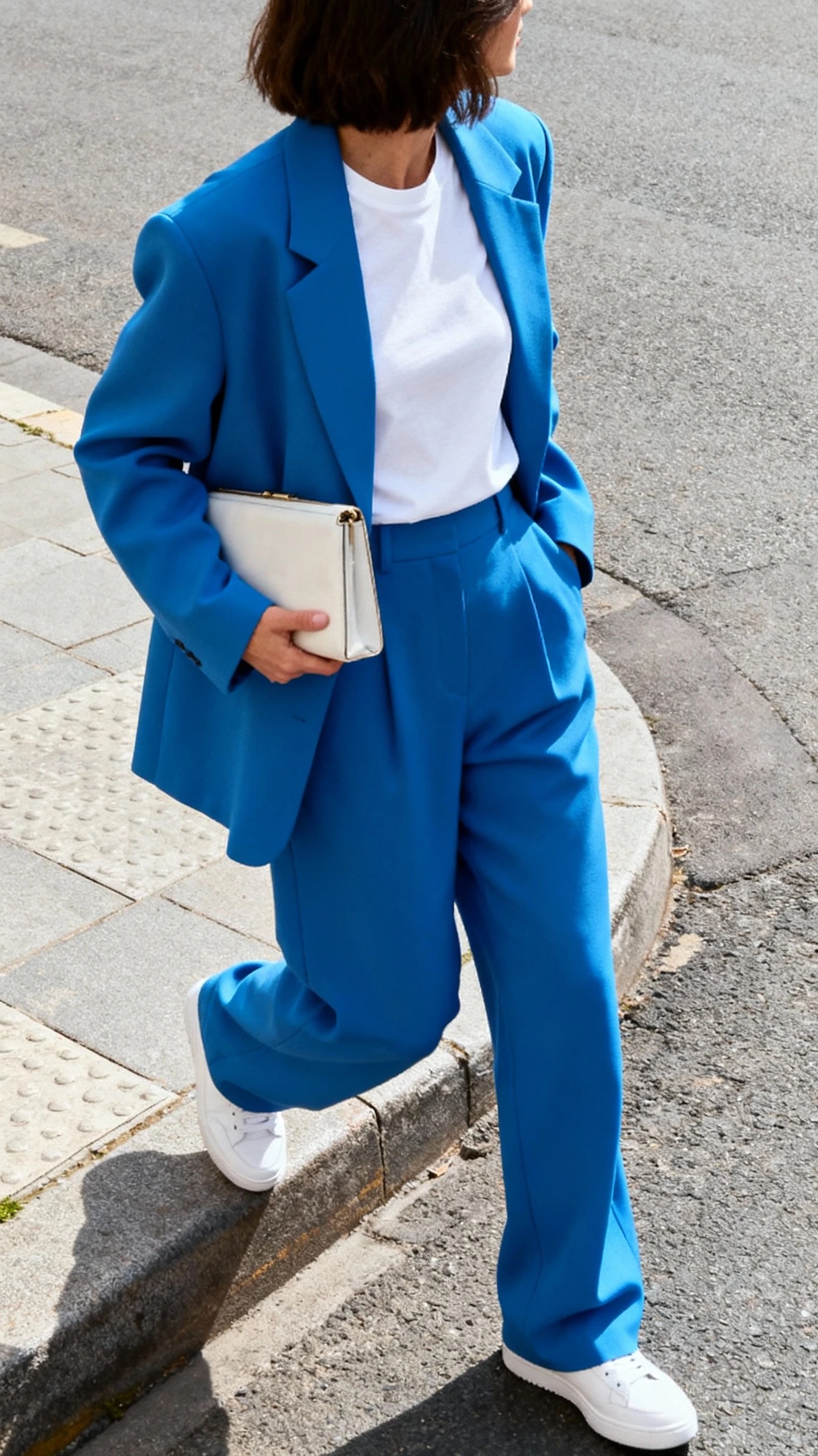 Sometimes the color is the outfit. A baggy suit in cobalt, emerald, or lipstick red makes you the exclamation point in any room. Keep everything else quiet and let the silhouette and hue do the work—effortless drama at its best.