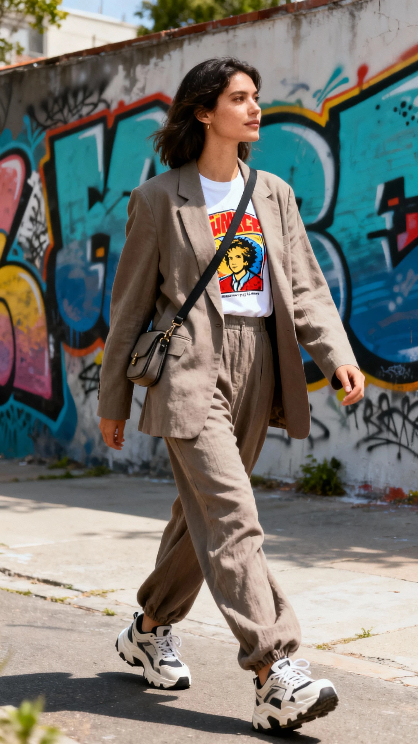 Bring your band tee (or that witty graphic) into grown-up territory by pairing it with a baggy suit. The contrast sells the look: refined tailoring meets downtown edge. It’s cool, confident, and seriously photo-ready.