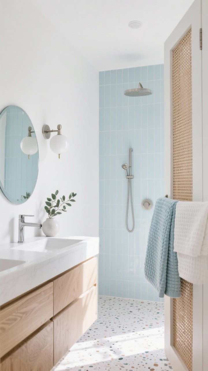 Use white oiled oak for the vanity with flat fronts and plenty of drawers. Walls stay crisp white, while the shower gets a pop with pastel blue vertical tile and minimal grout lines.