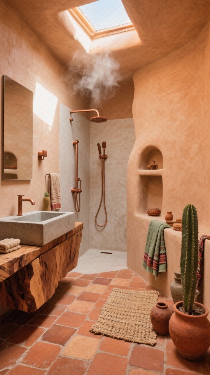 Warmth lovers, this is your bathroom. It’s sun-baked, textured, and welcoming—like a boutique hotel in Santa Fe.