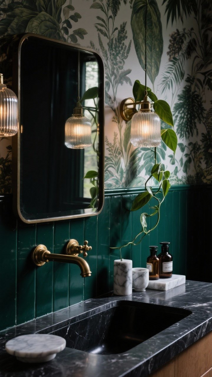 Paint the walls a deep ink green or oxblood in satin. Ground with a charcoal vanity and smoked quartz top. Behind the tub, install a botanical wallpaper mural sealed for baths—a storytelling moment.