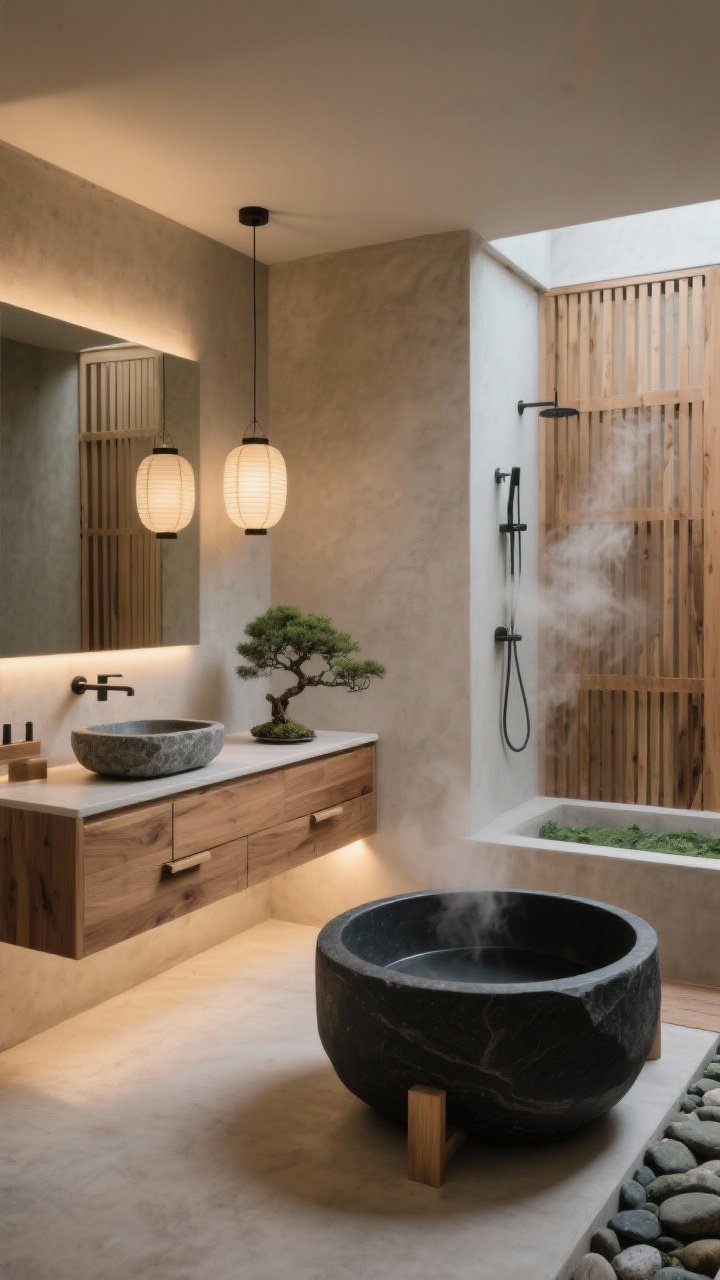 Finish with river rock shower bed, a single bonsai, and soft cotton robes. It’s quiet luxury without trying too hard.