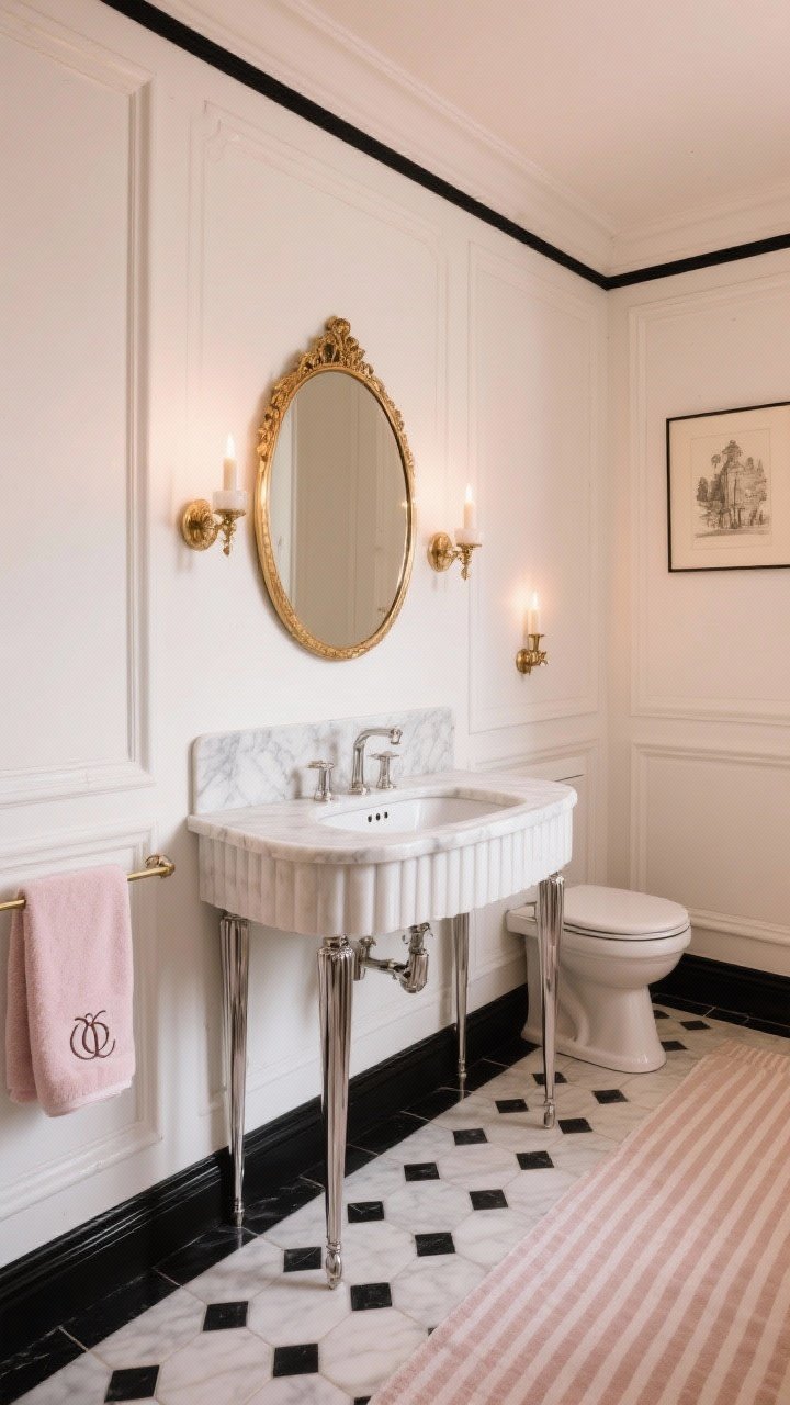 Flooring is mini hex tile with a black border; lighting is a pair of fluted alabaster sconces flanking an oval gilt mirror. Add a high-tank or skirted toilet for that timeless silhouette.