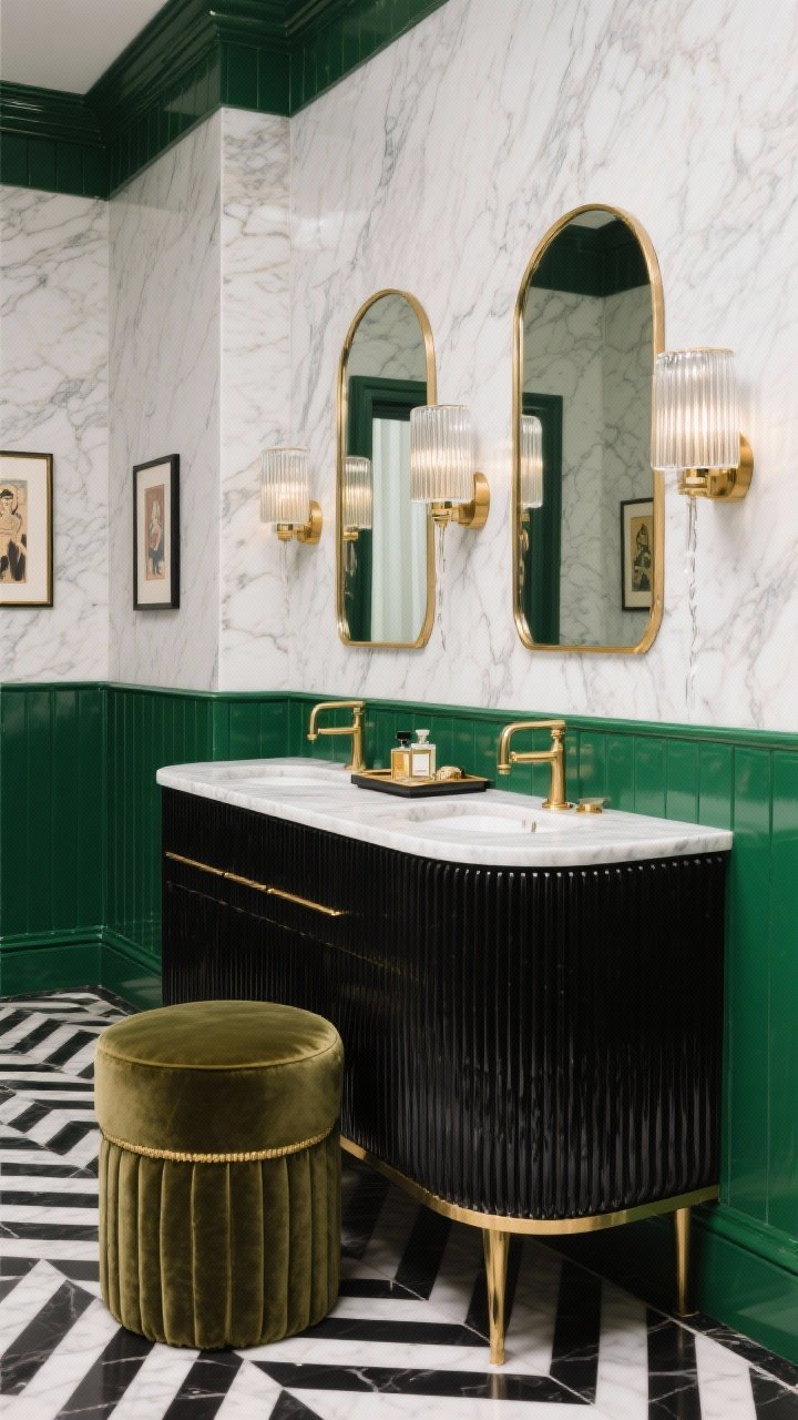 Wrap the room in emerald or midnight blue lacquered paneling on the lower half and marble-look porcelain on the upper walls. Choose a fluted vanity in high-gloss black with rounded corners and a veined Calacatta quartz top.