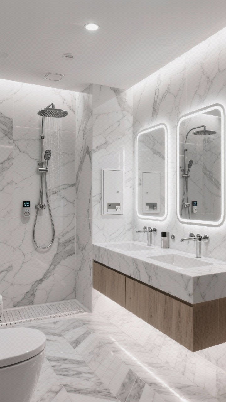 Add a floating white oak vanity for warmth, topped with matching slab. Mirrors? Backlit anti-fog smart mirrors with built-in displays. A digital thermostatic shower system remembers your settings, and motion-sensor toe-kick lighting guides midnight trips.