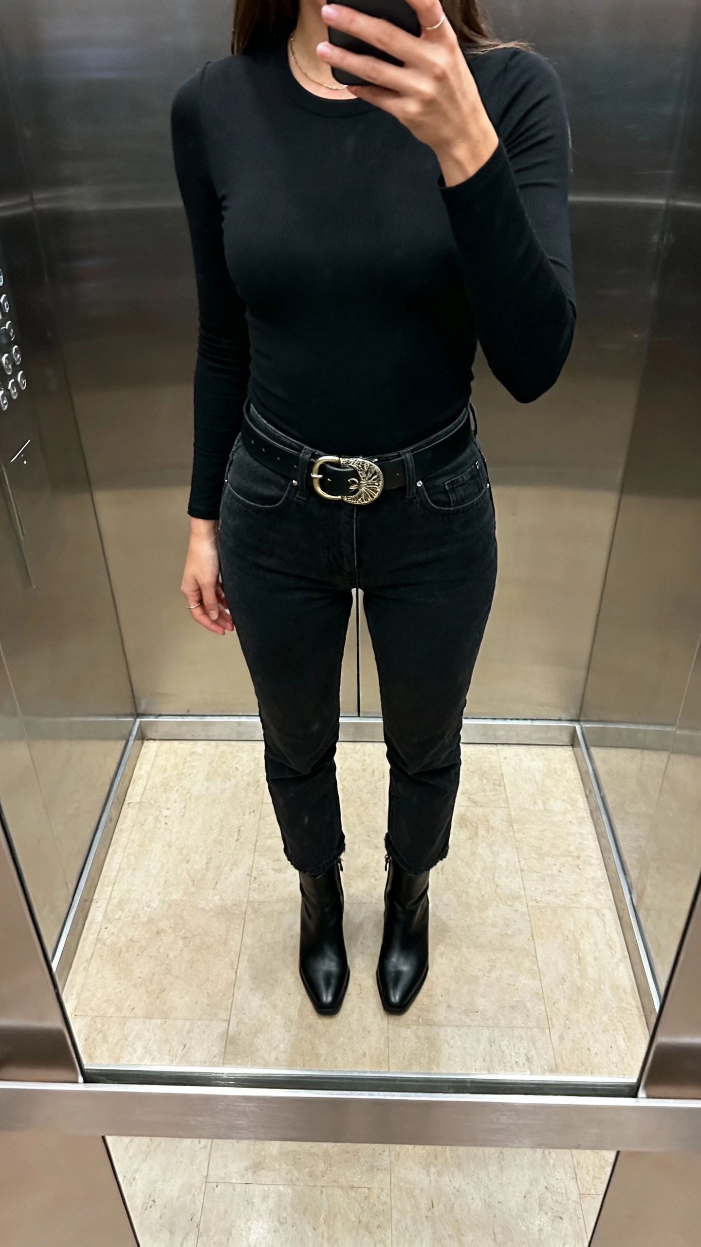 All black isn’t just chic—it’s a power move. Add a standout belt buckle and suddenly the whole look reads intentional and luxe. This is your go-to when you want maximum impact with minimal effort.