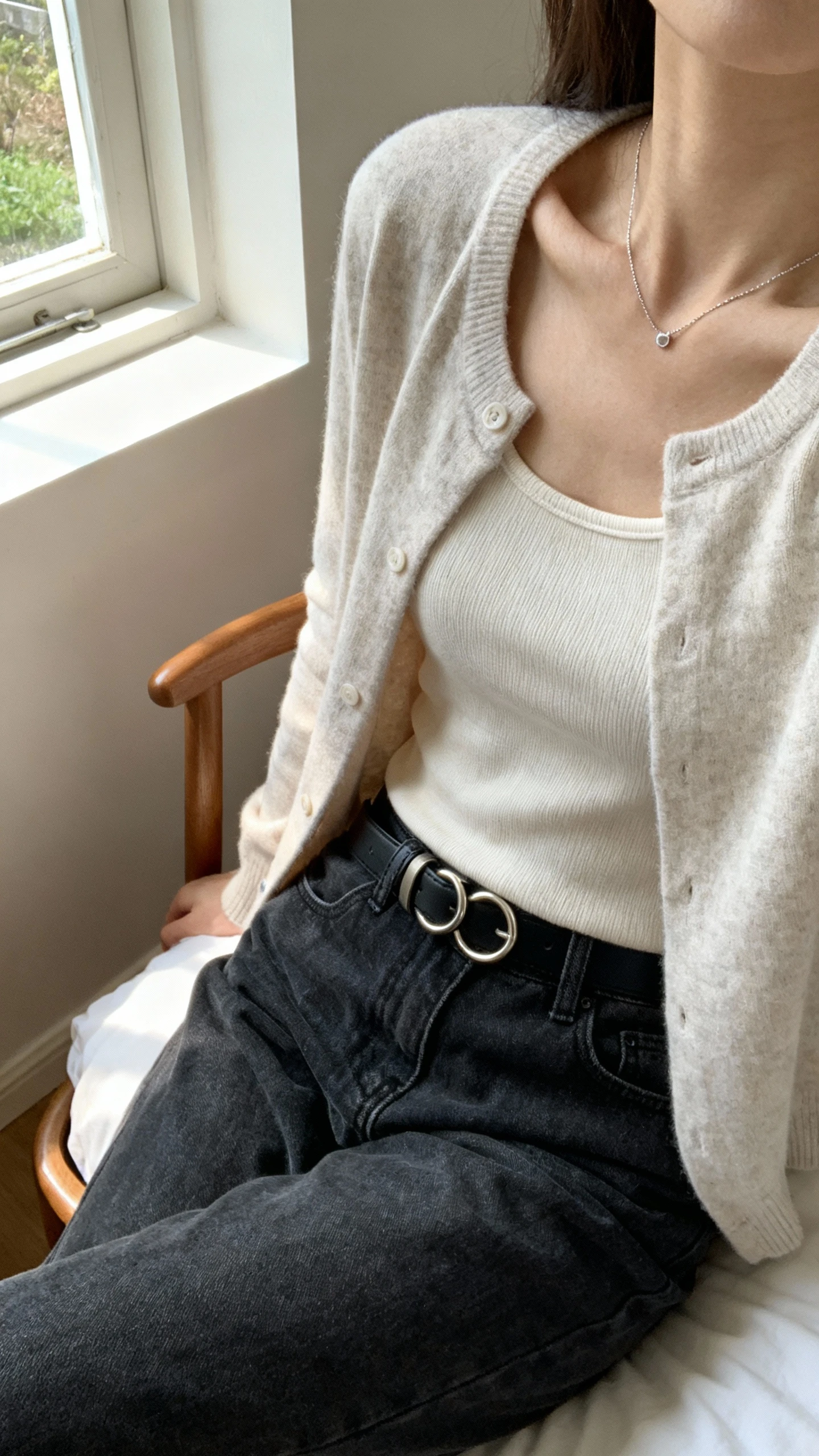 8. Soft Cardigan, Dark Denim, And A Double-Ring Belt