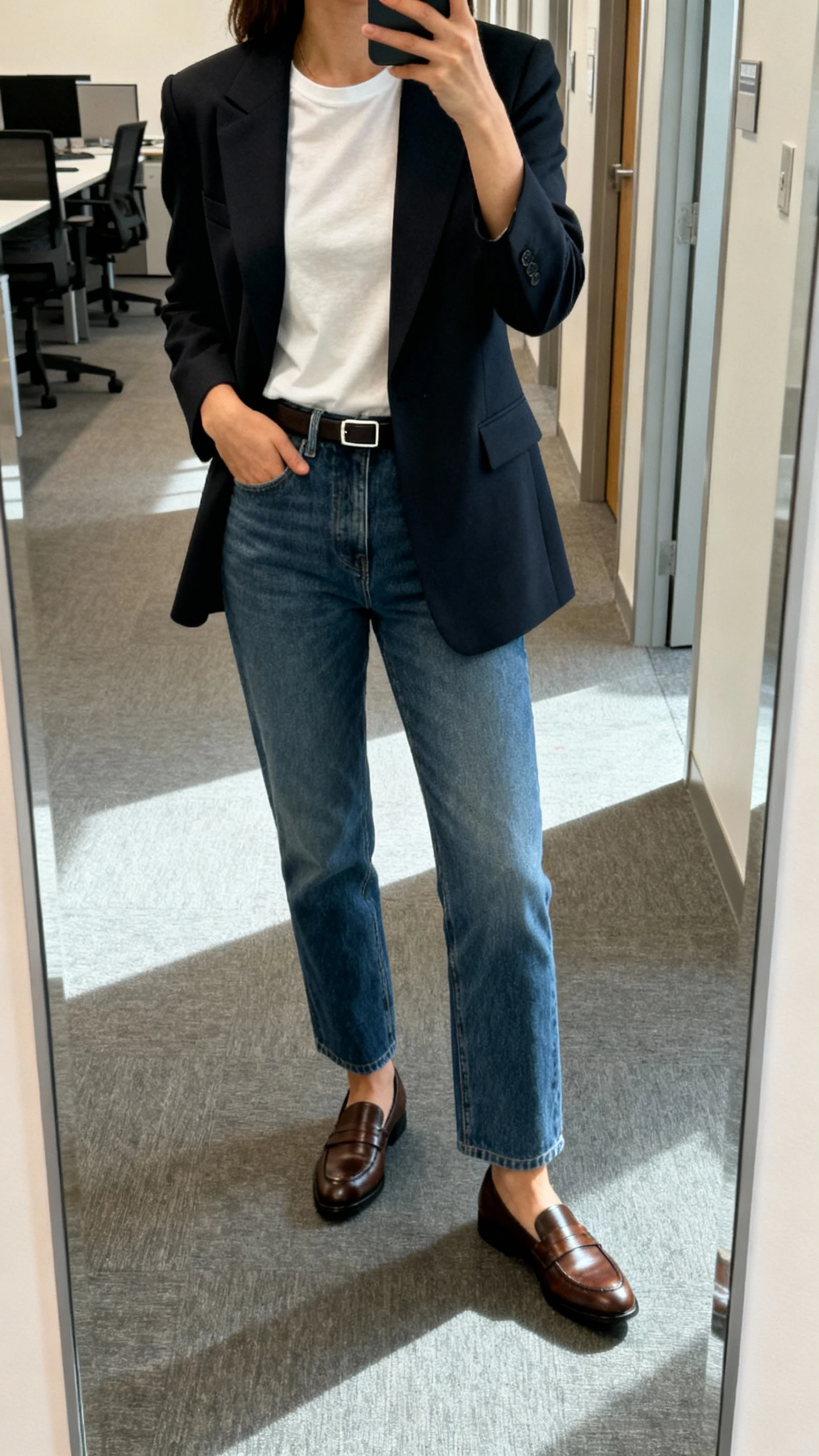 Start strong with a look that works for coffee meetings, casual Fridays, and anything that requires “I have my life together” energy. A sharp blazer plus a clean belt over great jeans is the definition of modern polish. It’s unfussy, streamlined, and secretly comfortable.