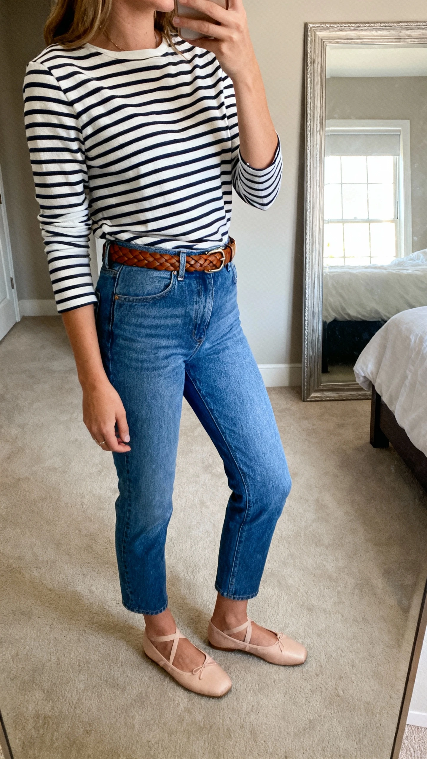 If “effortless” had a uniform, this would be it. Breton stripes, straight-leg denim, and a braided belt give you coastal meets city in the best way. It looks curated but never overdone—perfect for weekends, brunch, or strolling through a market.