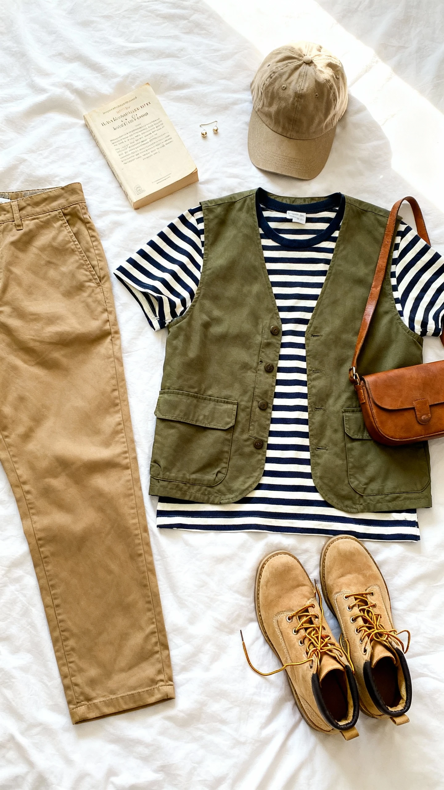 Old-school explorer meets Parisian cool. This combo mixes polished khaki trousers with classic stripes and a multi-pocket vest for a balanced look that’s playful and smart. It’s a subtle twist on tradition that never feels try-hard.