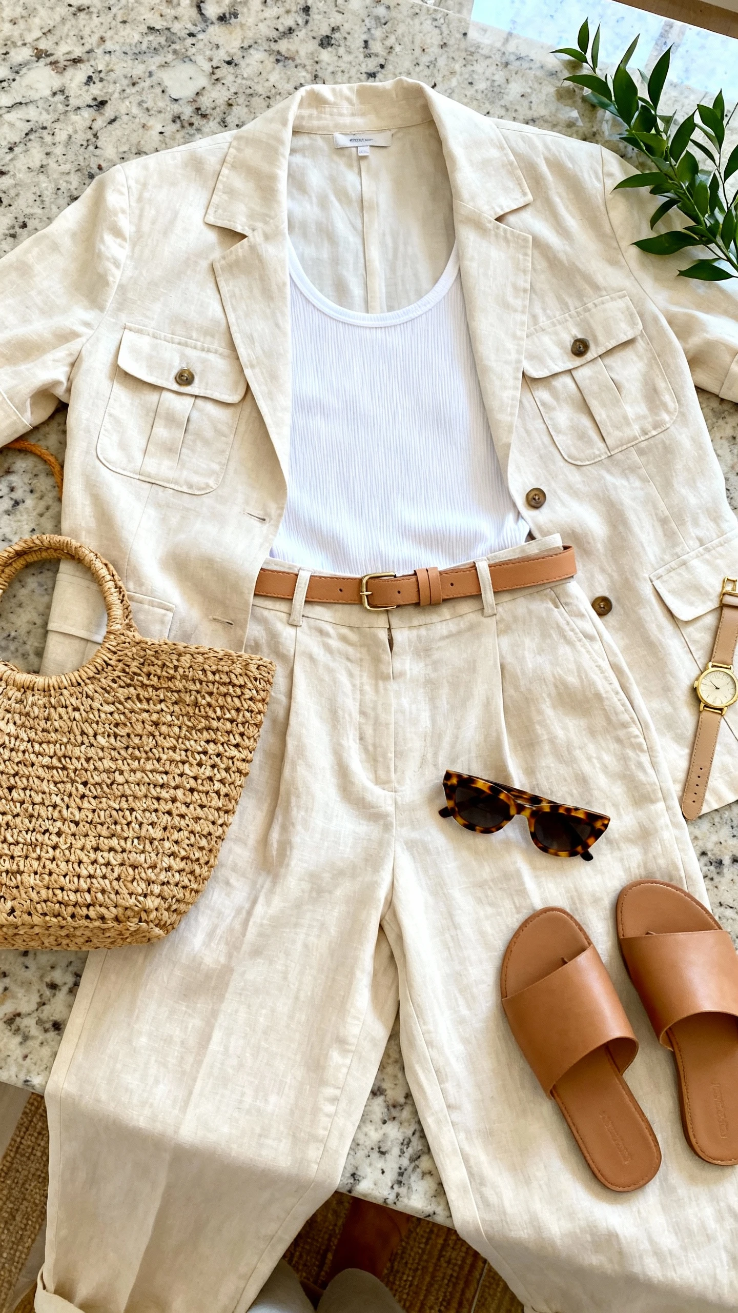 - Matching straight-leg linen pants, mid- to high-rise