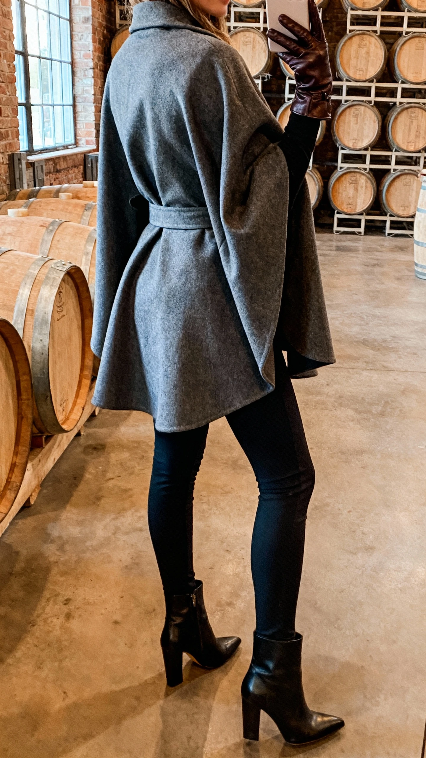 Drama, but make it wearable. A belted cape or poncho draped over slim pants creates that editorial shape without trying too hard. It looks elegant floating through the tasting room and keeps heat trapped where you want it.