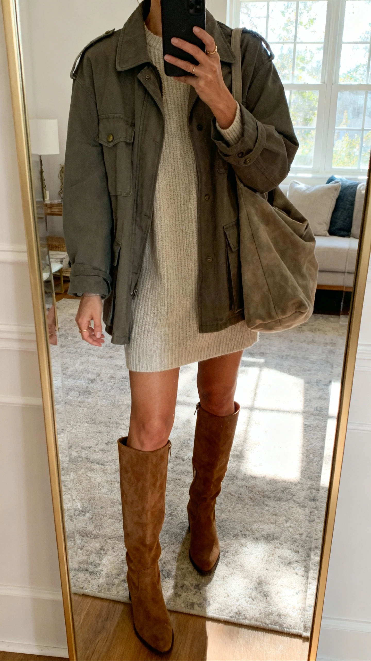 9. Utility Jacket + Sweater Dress + Over-The-Knee Boots For Effortless Cool