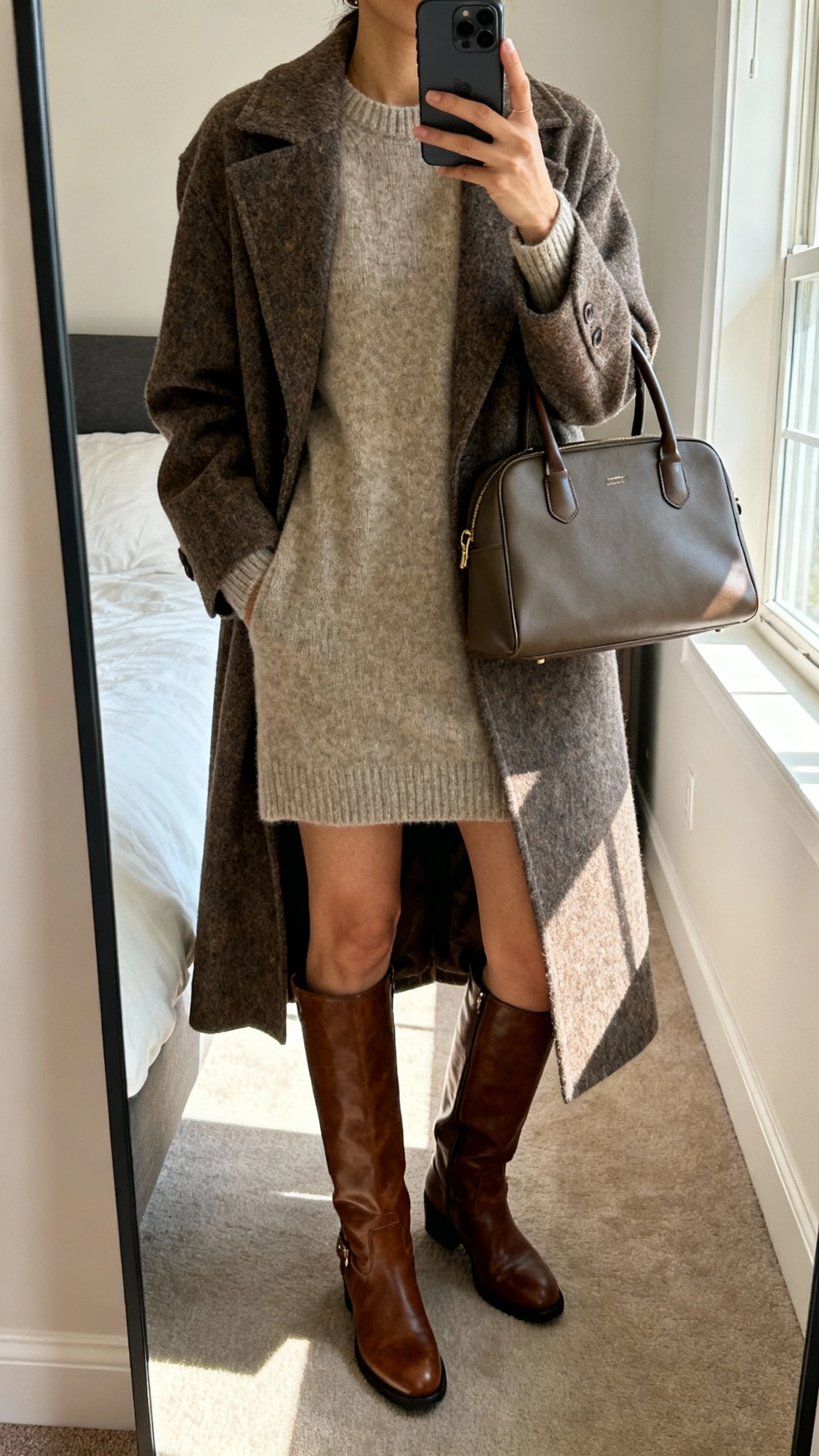 This outfit is all about quiet luxury with movement. A swishy cashmere sweater dress under a structured heritage wool coat reads elegant but approachable—perfect for sipping by the fireplace or touring the barrel room. It’s timeless, ridiculously comfortable, and looks even better with a glass in hand.