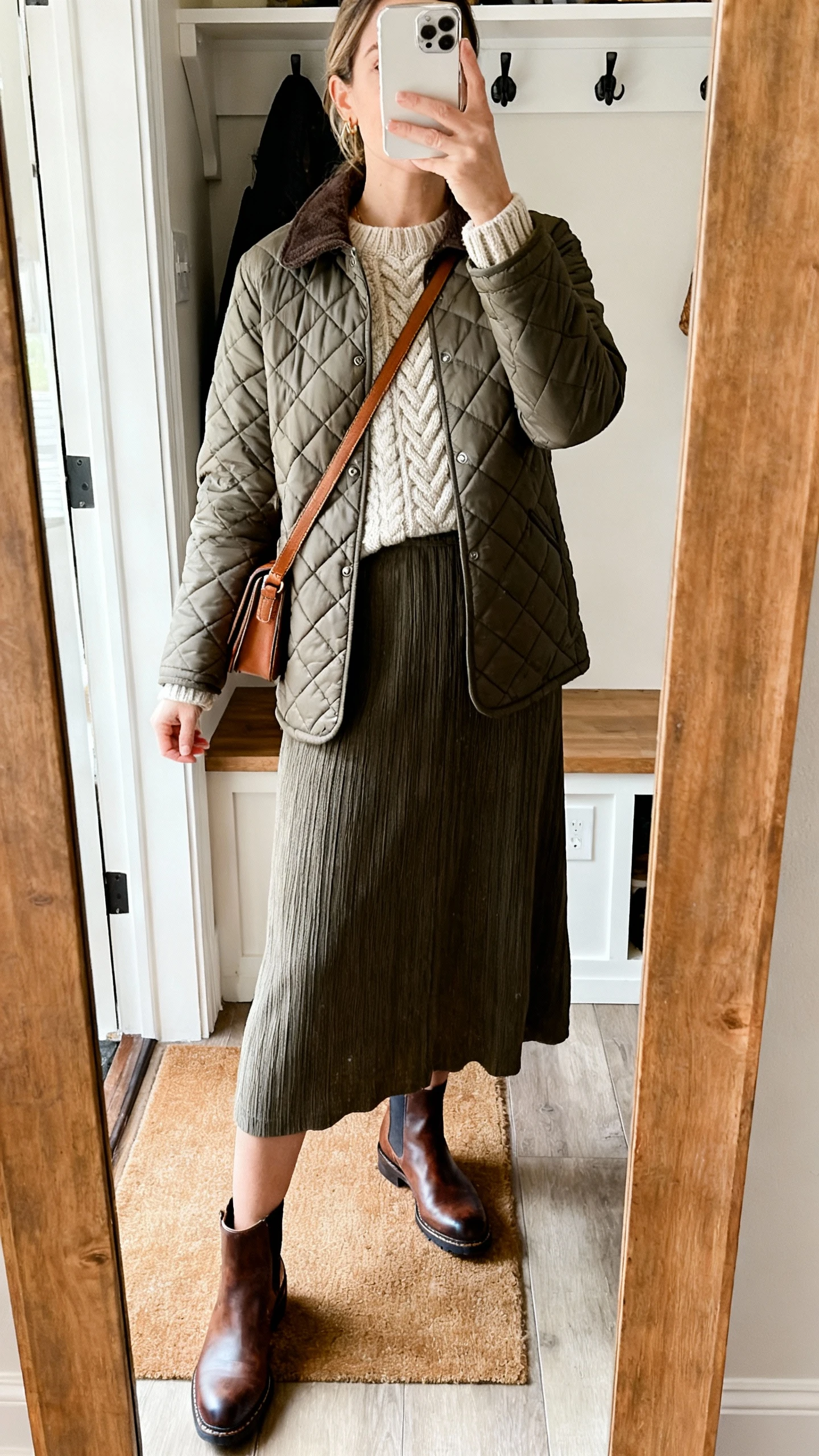 6. Quilted Barn Jacket + Midi Skirt For English-Countryside Meets Napa