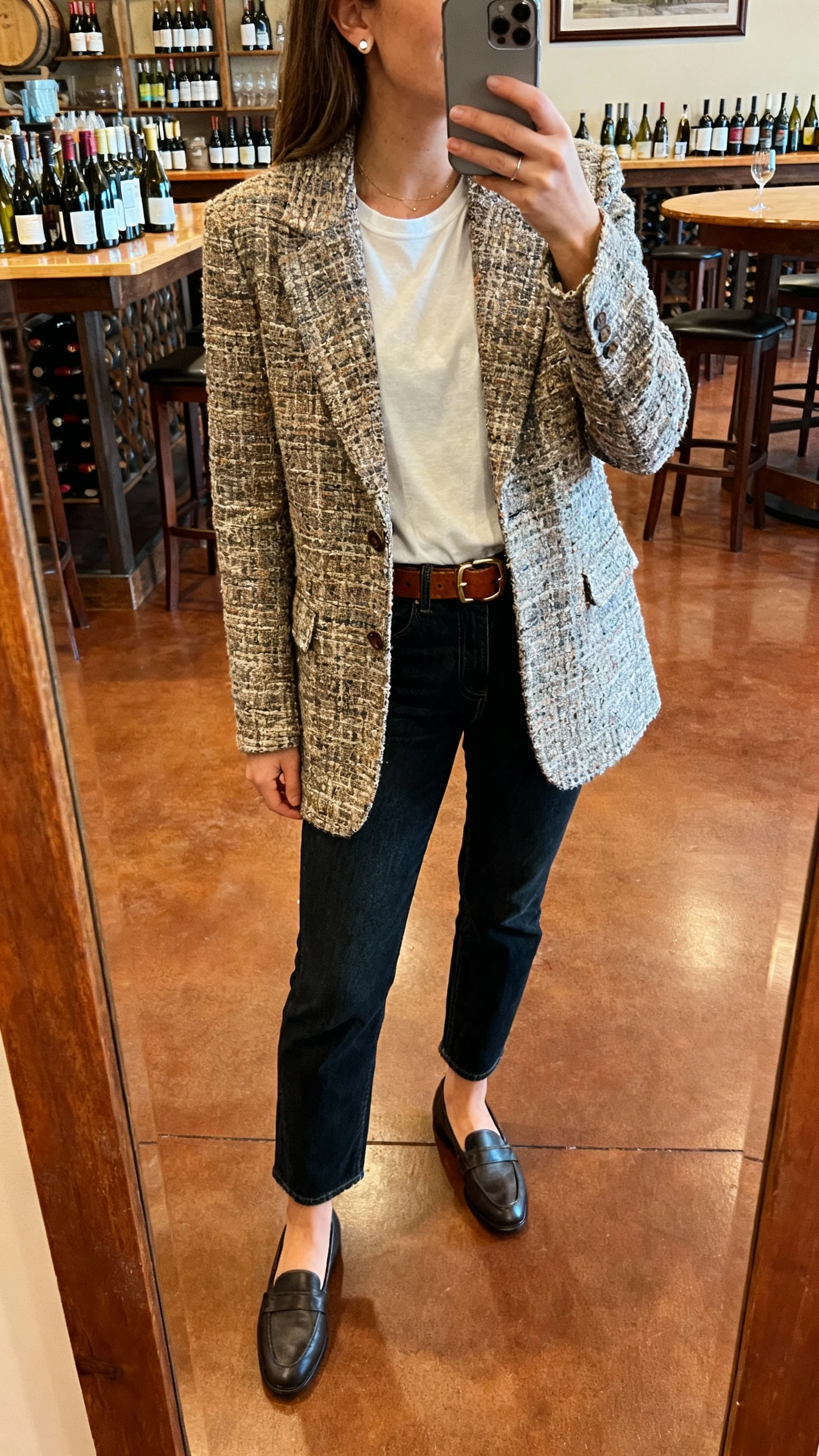 3. Tweed Blazer + Dark Denim That Says “I Know My Pinot”