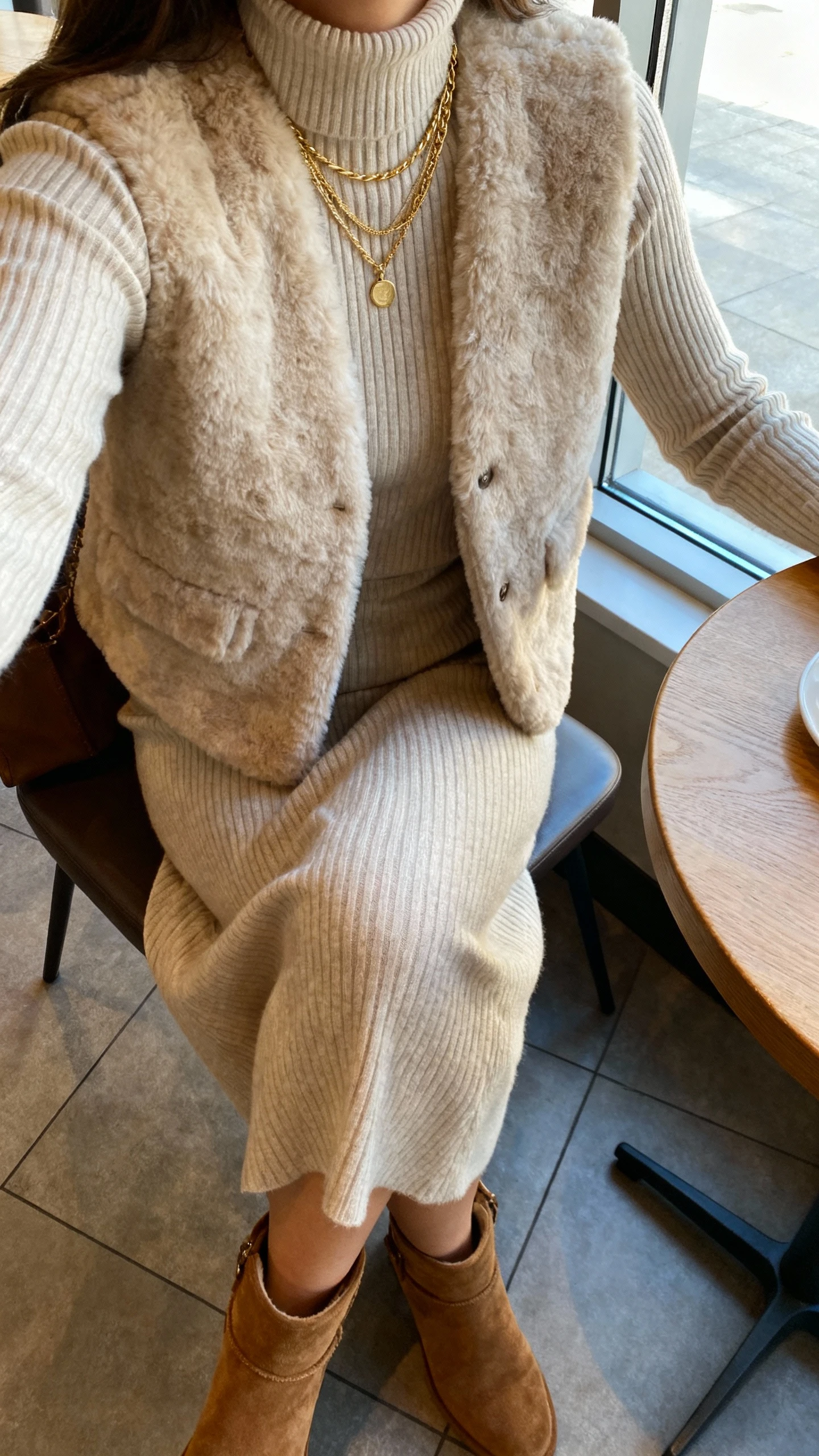 7. Tonal Knit Layers + Shearling Vest For Cozy Texture Play