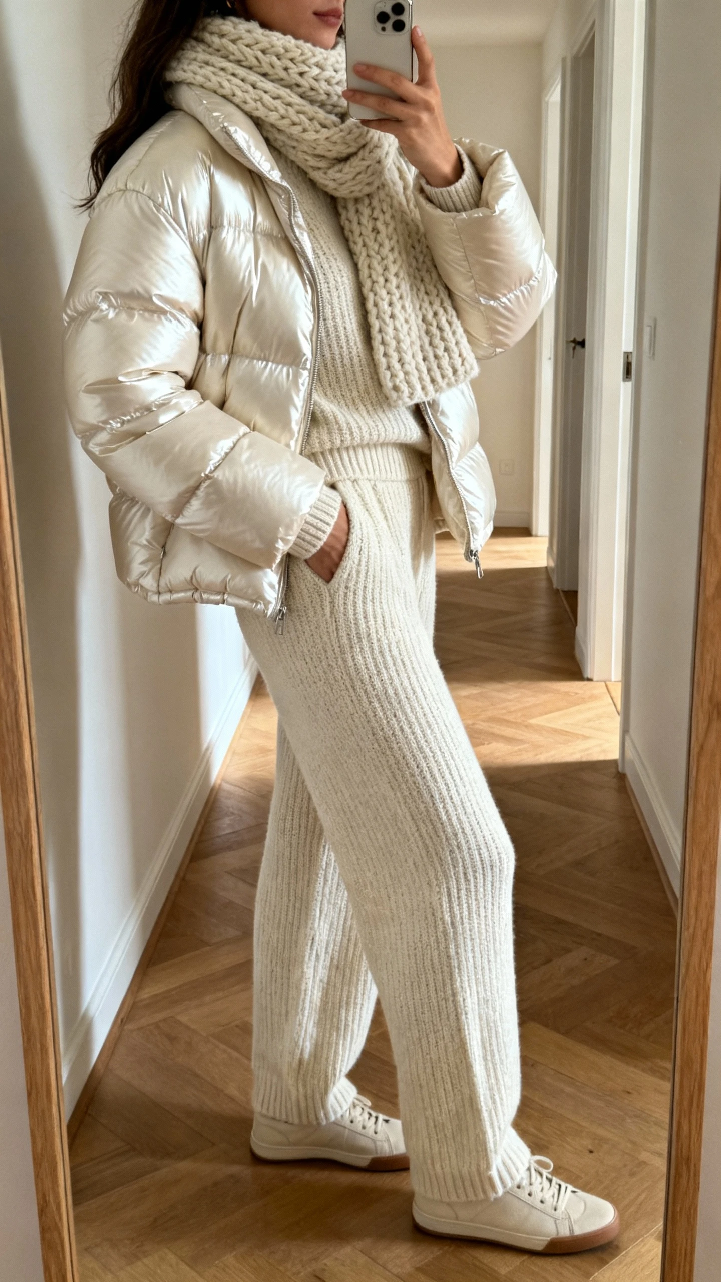 2. Puffer Chic + Monochrome Knit Set For Warmth Without Bulk