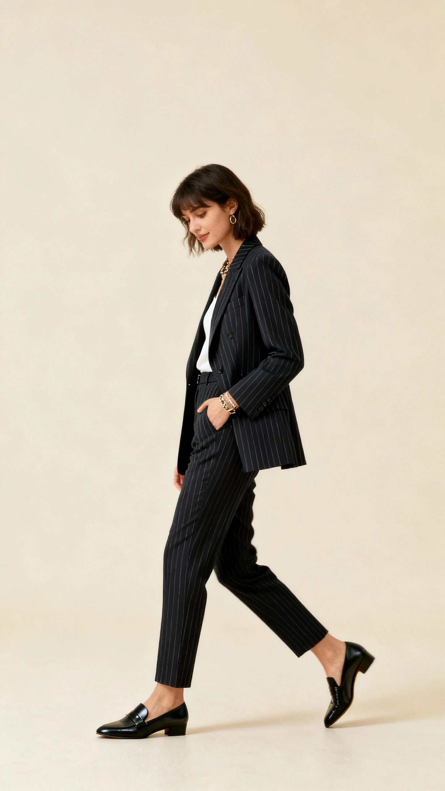 - Pinstripe blazer (navy with pale stripe or charcoal with soft white)