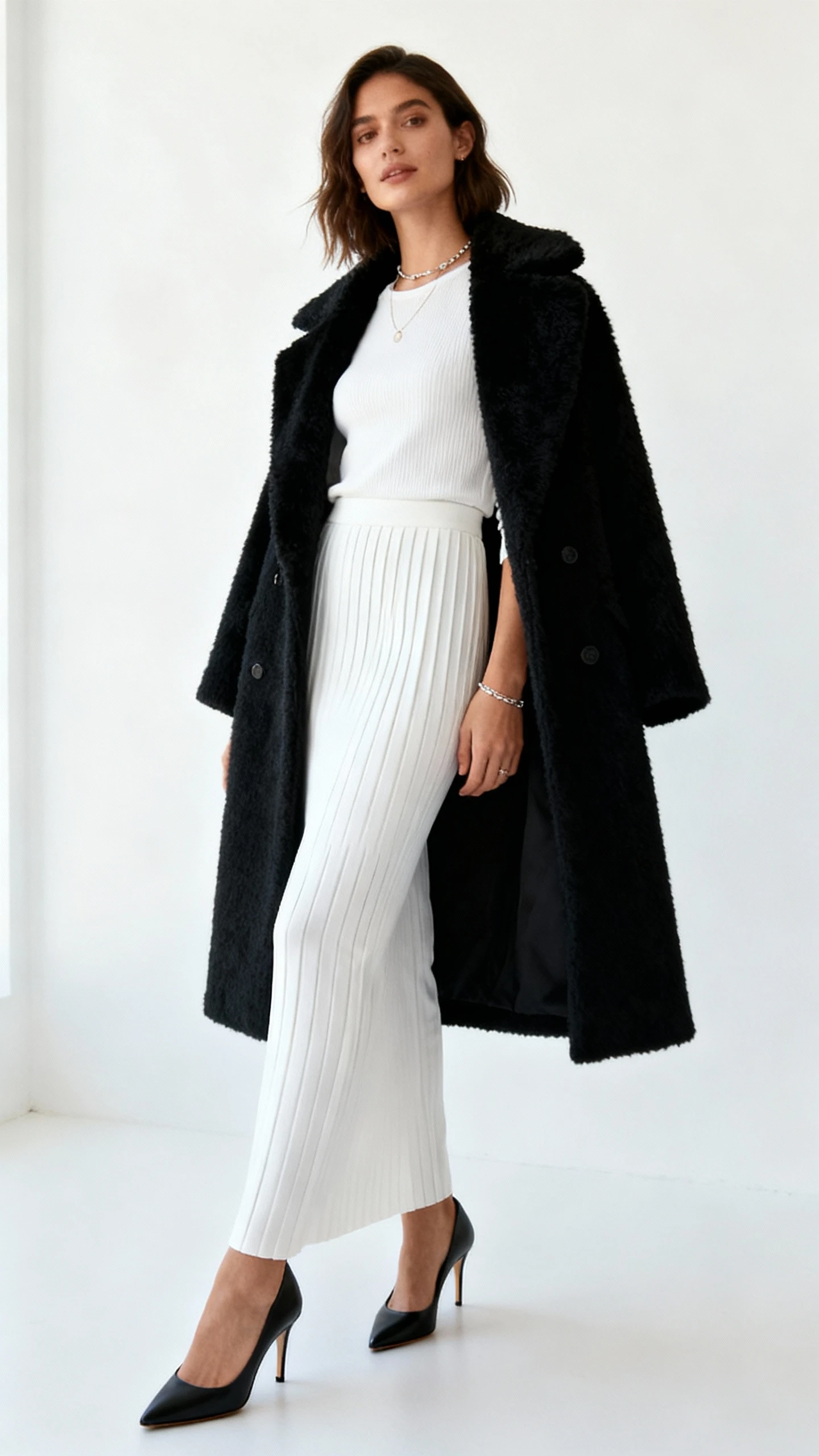 This outfit is all about long, uninterrupted lines that make you look tall, poised, and laser-focused. The monochrome base creates the “column,” and the structured coat adds presence. It’s elegant, strategic, and surprisingly easy to pull together on a busy morning.