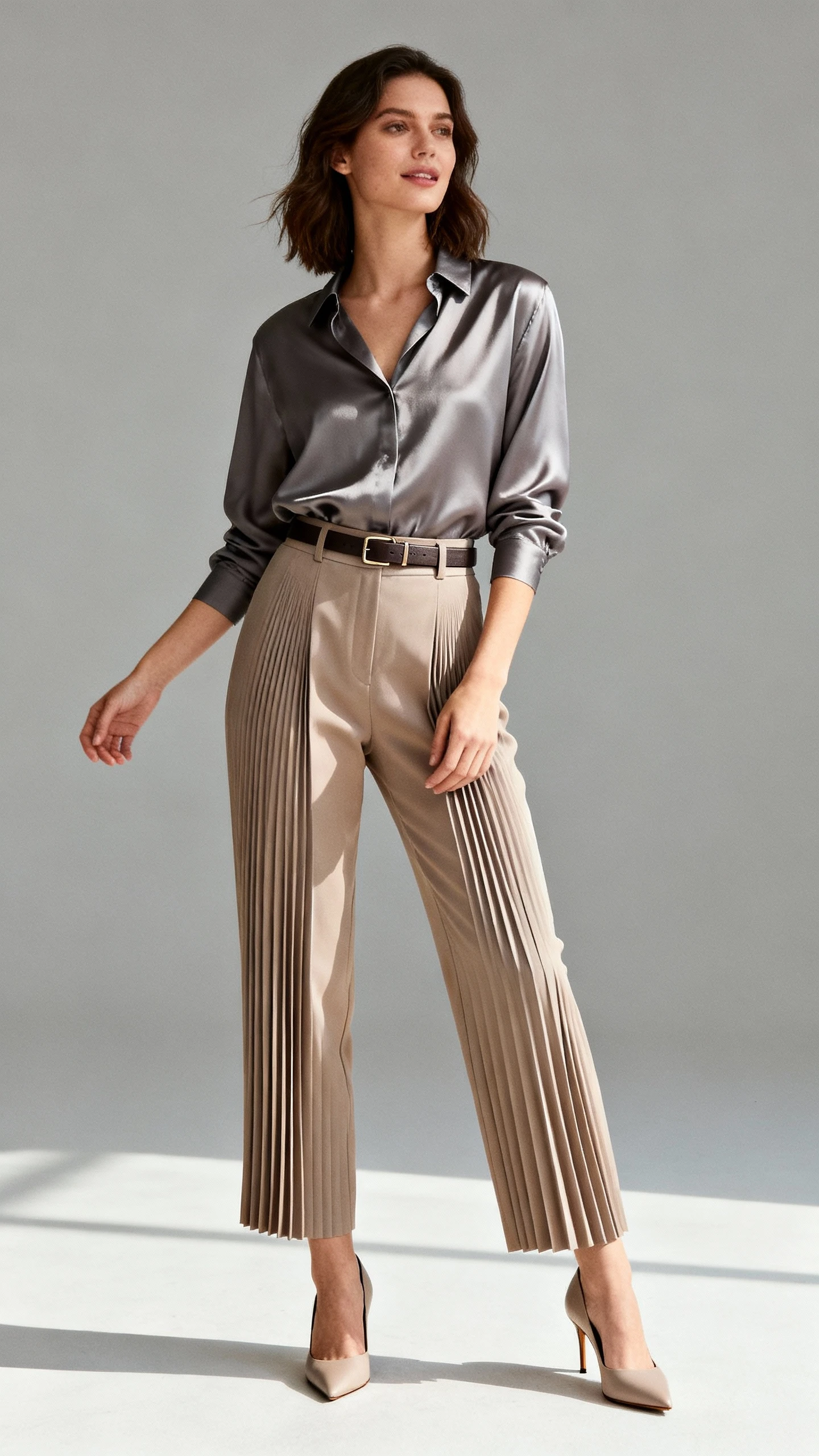 - Choose matte fabrics to keep it formal; avoid high-shine pleats.
