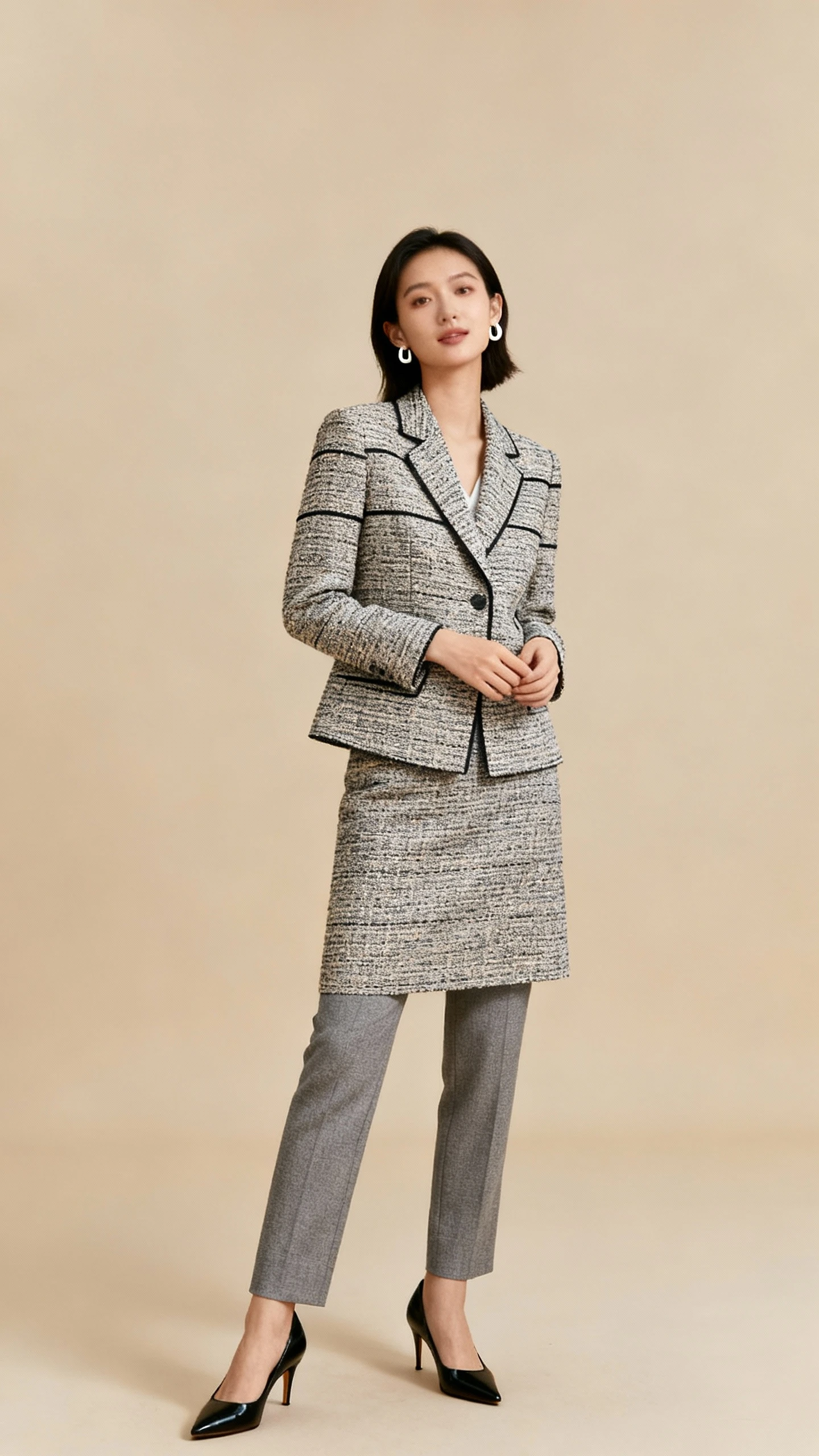 Tweed can be sharp and contemporary—think clean cuts and subtle textures, not bulky jackets. A streamlined tweed set gives you gravitas and texture that plays well on camera and in person. It’s “heritage meets modern counsel” in the best way.