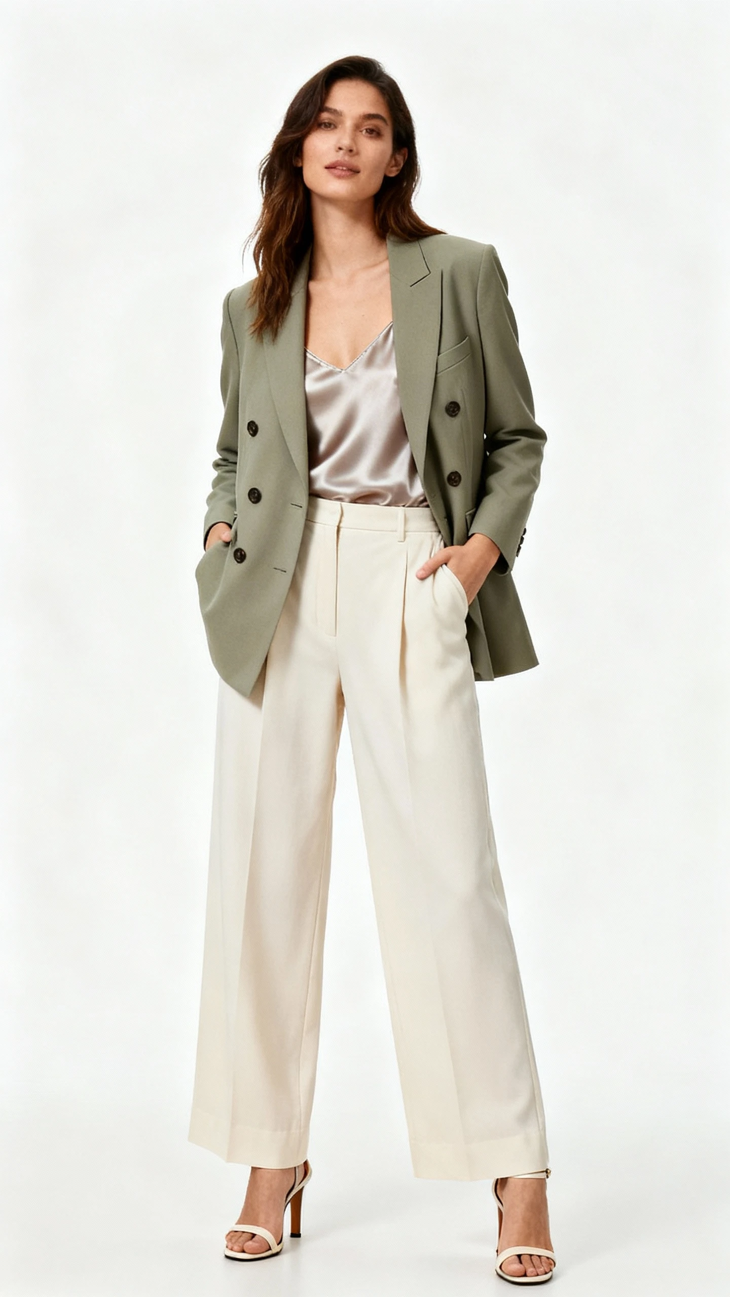 This is your “I own the room” outfit. A double-breasted blazer builds instant structure, and the wide-leg trousers deliver long lines and movement. It’s assertive without being aggressive—precisely the impression you want in high-level scenarios.