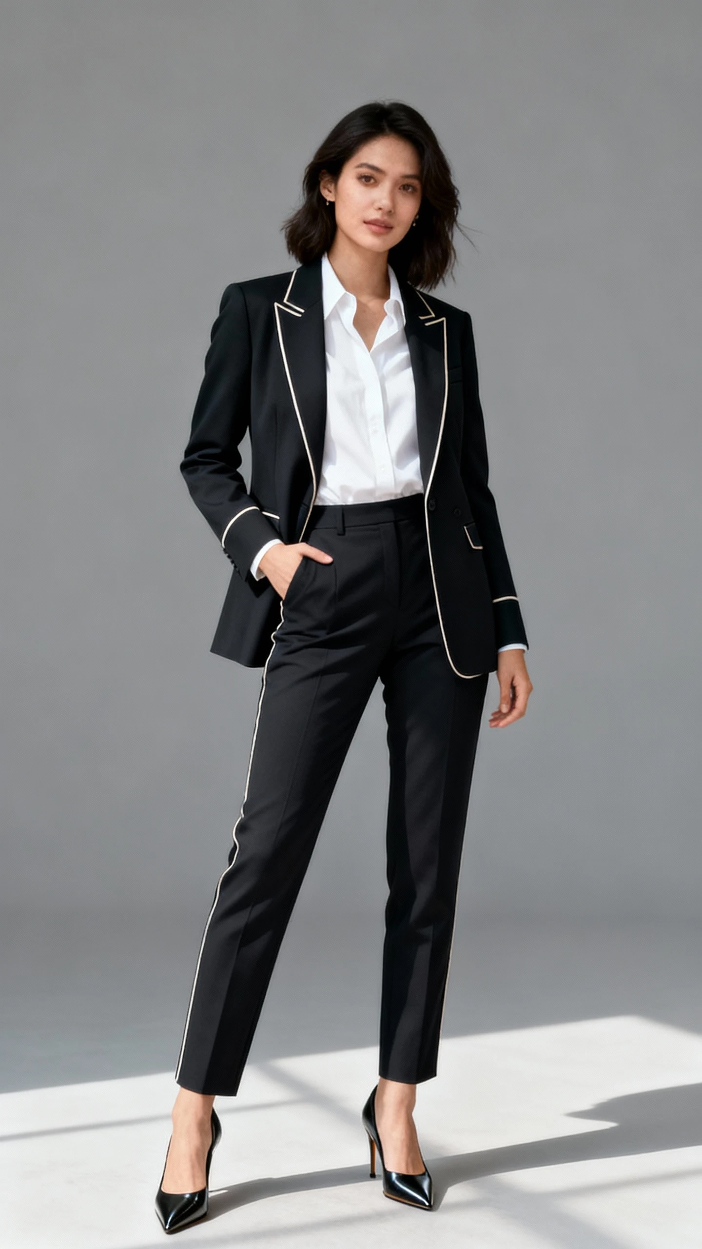 - Tailored blazer with subtle contrast piping (charcoal, navy, or jet black)