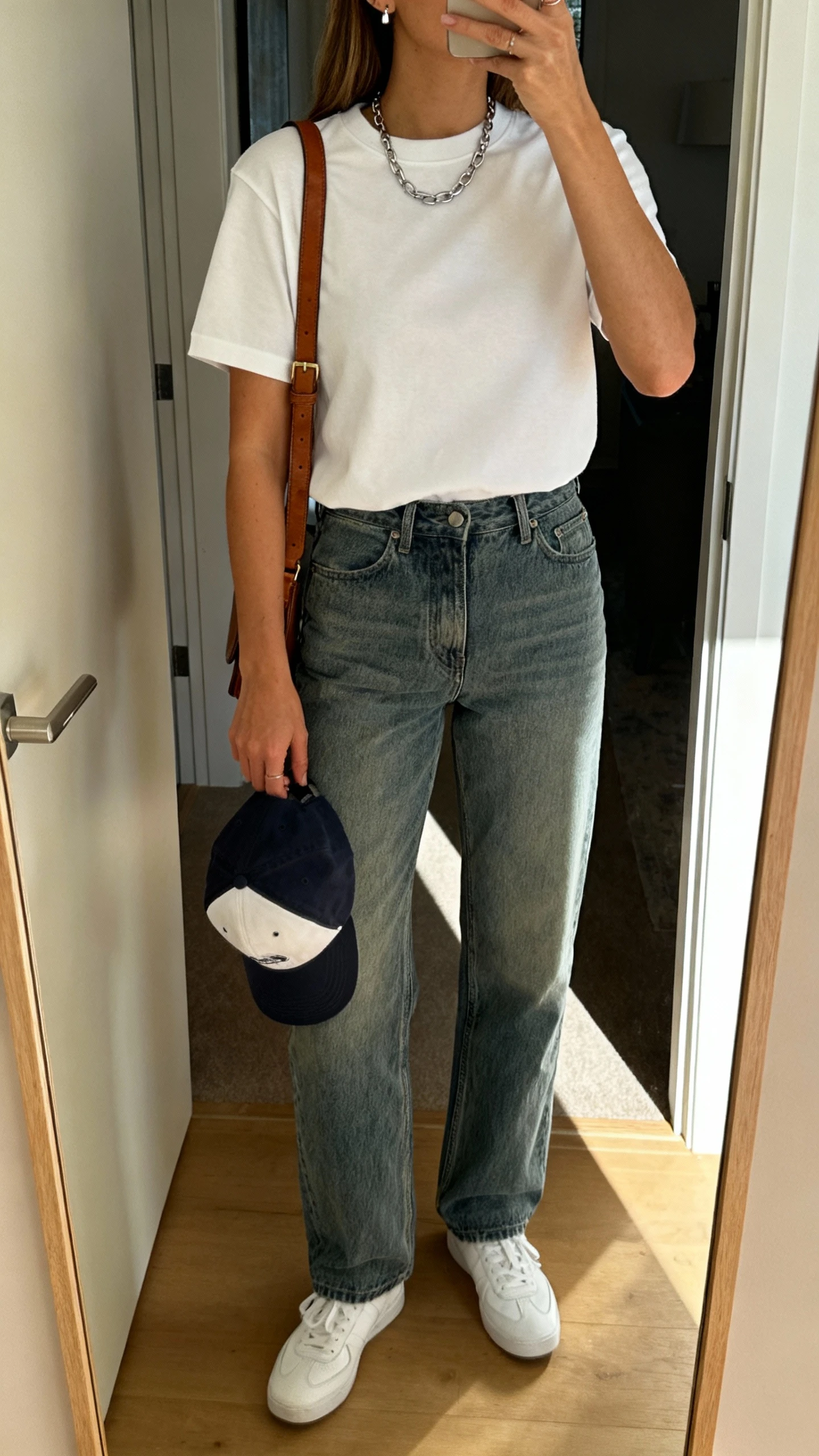 - High-quality white T-shirt (slightly boxy or fitted crewneck)