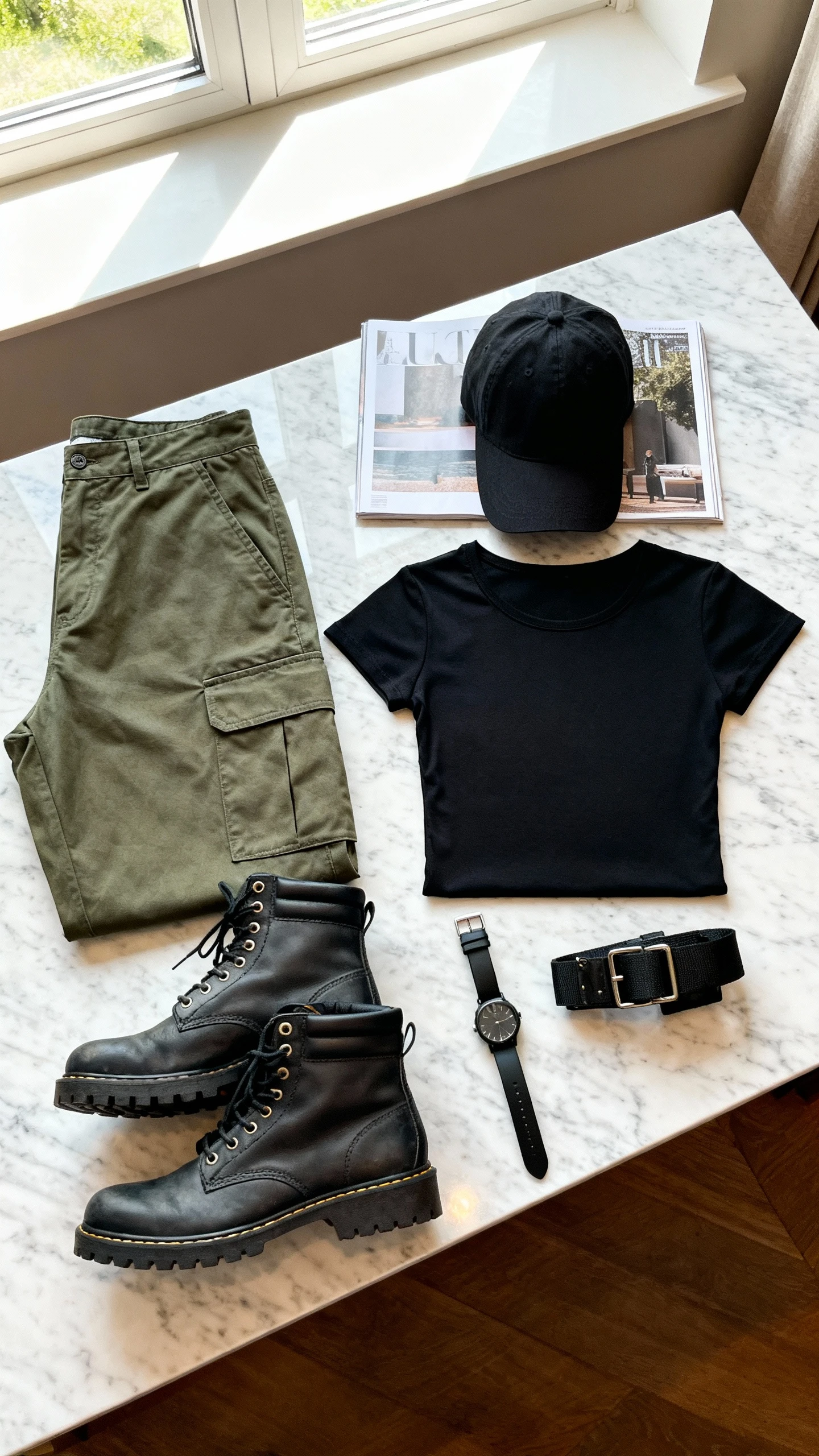 That “I just threw this on” look that somehow steals the show. Cargos and combat boots were made for each other—add a fitted tee to keep proportions balanced and throw on some sleek accessories to elevate the whole thing.