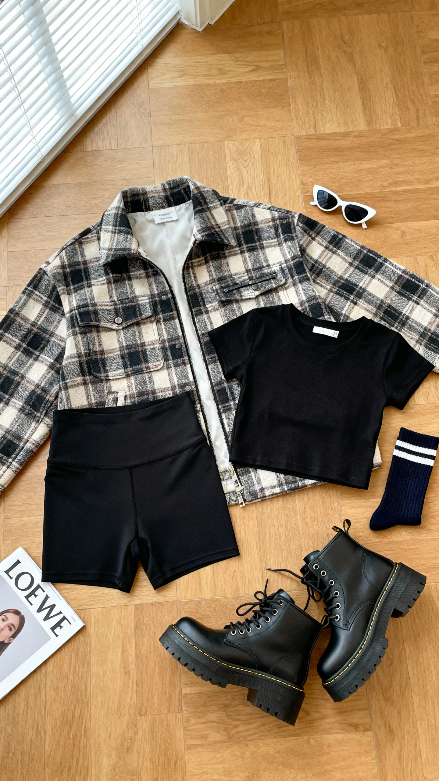 When it’s too warm for heavy layers but you still want that street edge, this combo hits. The shacket adds weight up top, bike shorts keep it sporty, and combat boots bring balance. It’s surprisingly wearable and super photogenic.