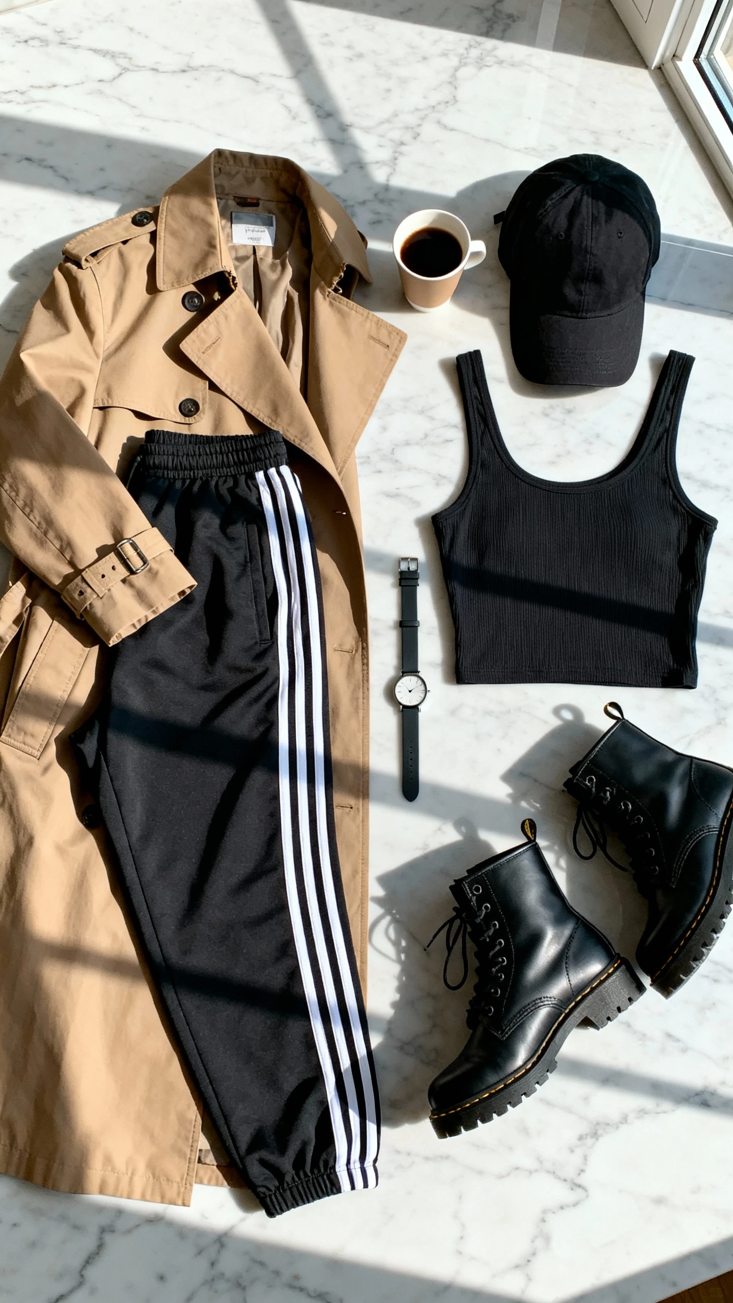 Athletic meets classic in a way that whispers “I know what I’m doing.” Track pants bring the comfort, a trench adds sophistication, and combat boots punch it up with texture and presence. It’s commuter-chic with a twist.