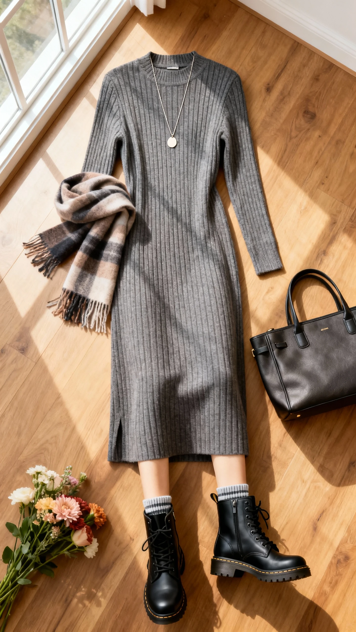 Soft dress, tough boots—it’s the contrast we all live for. A knit dress makes getting ready dangerously easy, and the boots add structure so the whole thing feels intentional, not sleepy. Bonus points for visible socks and a crossbody to keep it street-ready.