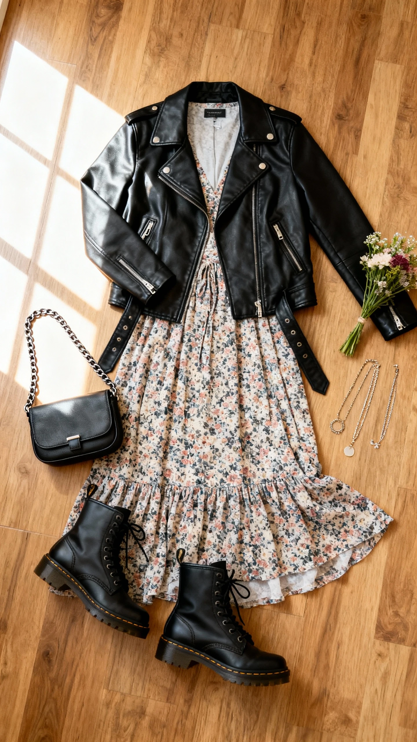 Flirty meets fierce. A soft floral dress gets a heavy-hitter upgrade with combat boots and a leather jacket. It’s the perfect balance for concerts, date nights, or any place you want to look chill but put-together.