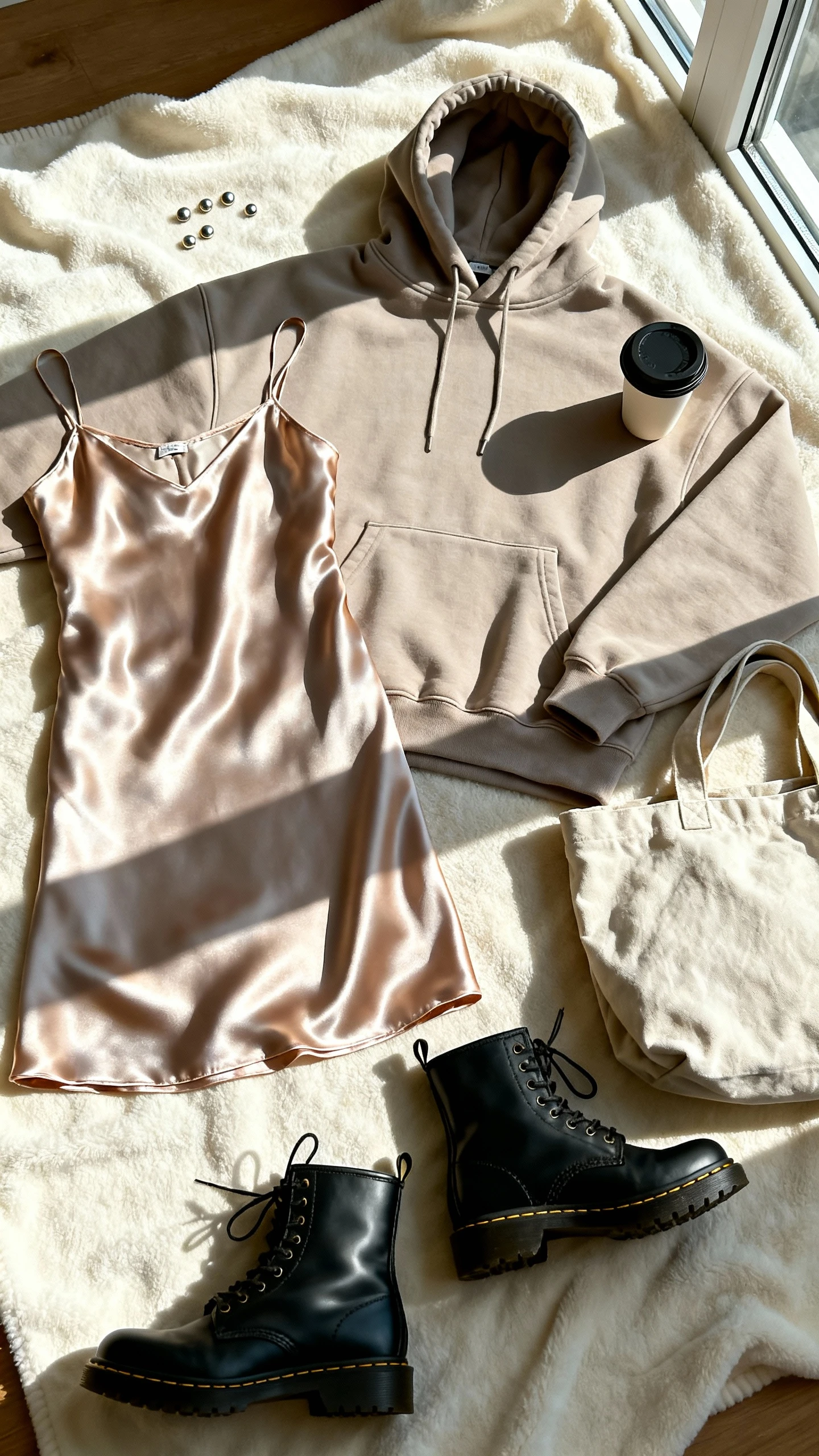 Silky meets street. A satin slip skirt adds movement and polish, while a hoodie keeps it casual and current. Combat boots cut the sweetness, making the whole look wearable and a little rebellious.