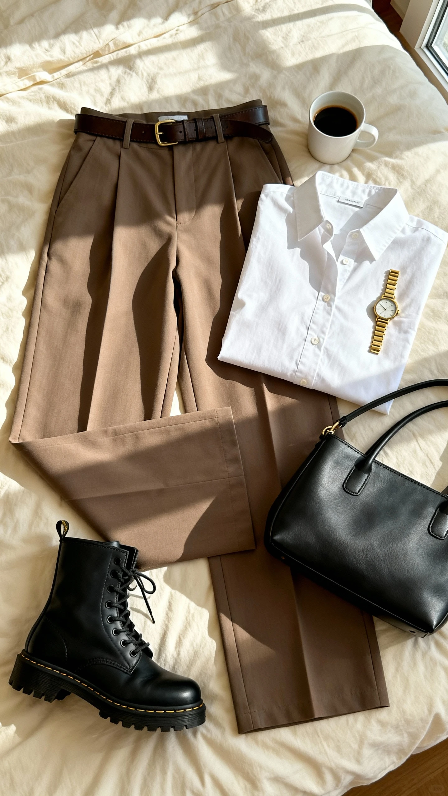 Office-meets-street perfection. Wide-leg trousers feel grown-up and tailored, while combat boots add just enough grit to keep it cool. A crisp shirt finishes the look with sharp lines and major polish.