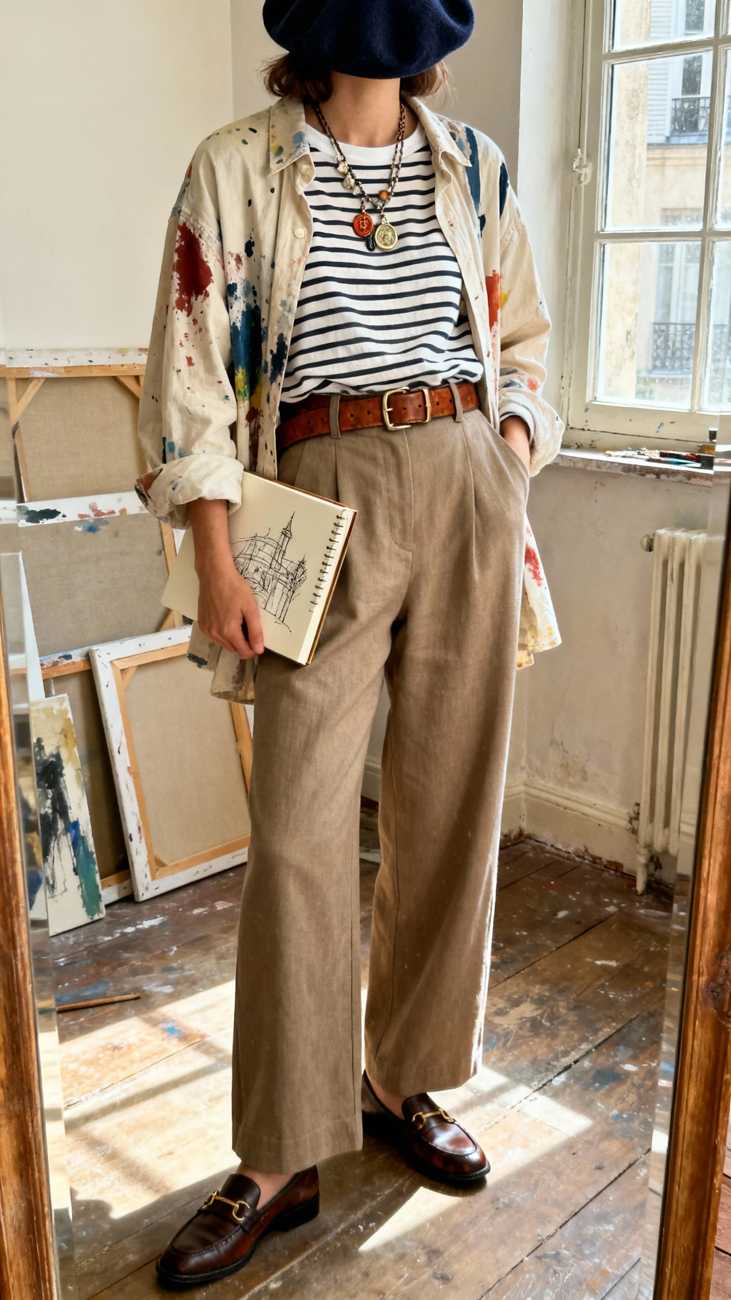This look feels like cafés, sketchbooks, and soft jazz floating through a drafty studio. It’s relaxed yet thoughtful, with clever shapes and textures that layer beautifully. Great for creative days, gallery visits, or writing sessions where you want your outfit to spark ideas.
