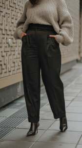 High-waisted trousers are your BFF. They cinch your waist and create the illusion of longer legs, especially when paired with a slightly oversized chunky sweater.