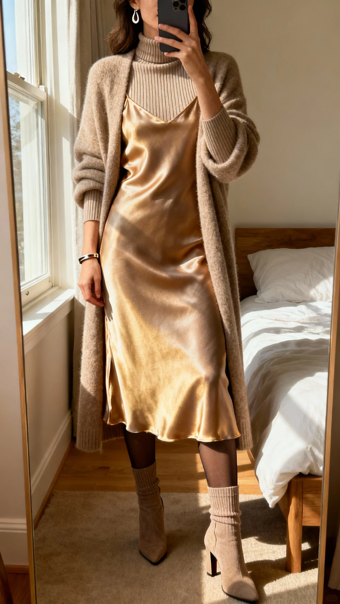 8. Luxe Layer Cake: Turtleneck + Slip Dress + Long Cardigan