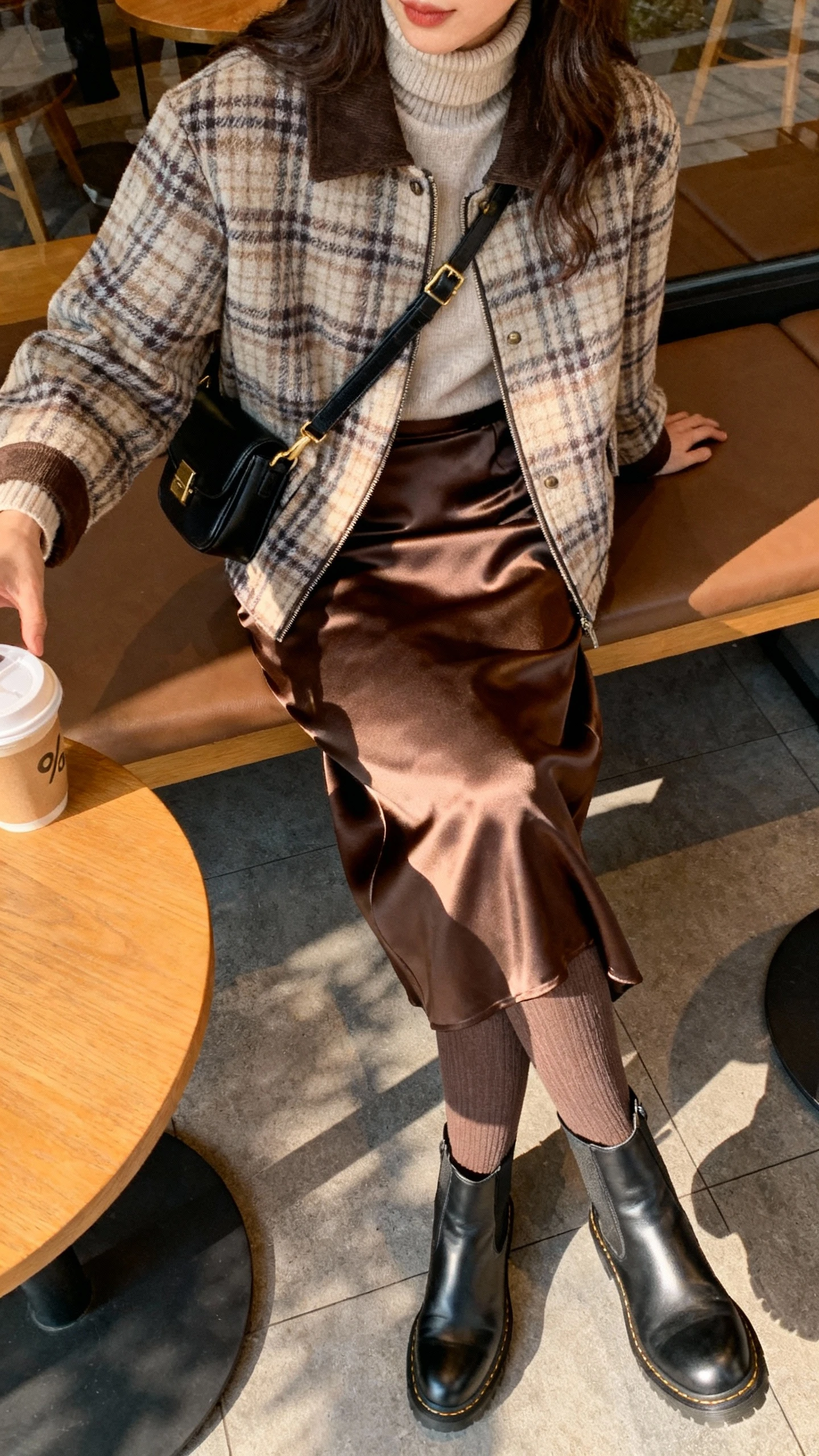 - Balance shine with matte: satin skirt + wool top is a chic contrast.