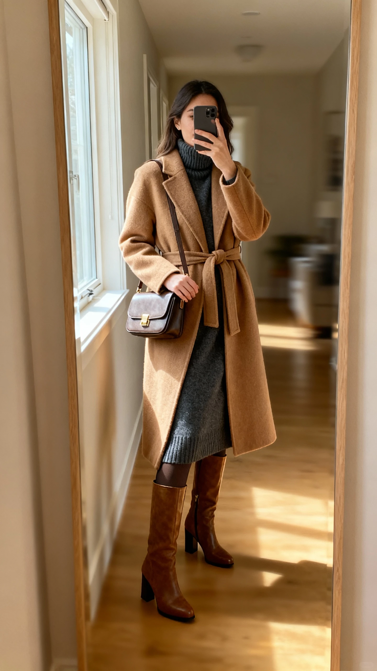 This look is designed for strolls through snowy streets and candlelit dinners. A belted wool coat over a fitted turtleneck sweater dress equals instant romance and warmth. You’ll look like you belong on a winter movie poster—trust me.