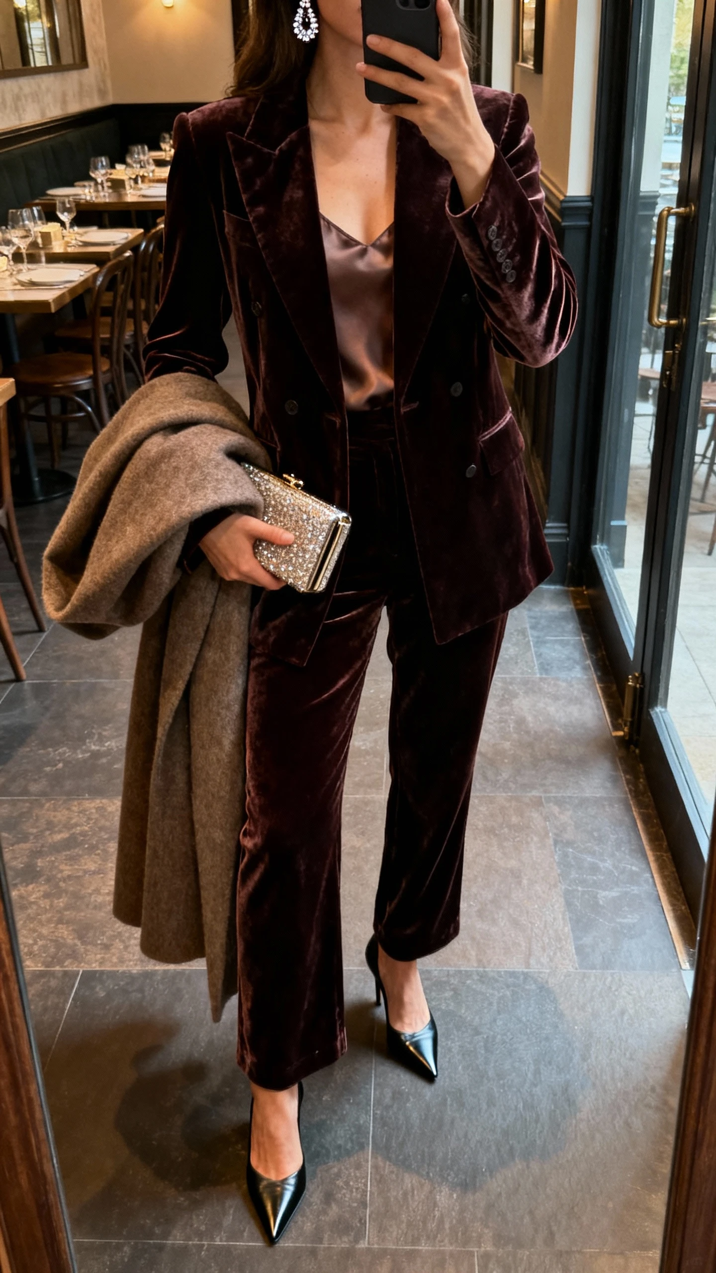 This is the wow moment—the outfit you’ll remember. A velvet suit feels festive, bold, and insanely flattering in candlelight. It’s tailored, plush, and perfect for a fancy date night, a holiday-season honeymoon, or any moment you want to dial up the drama.