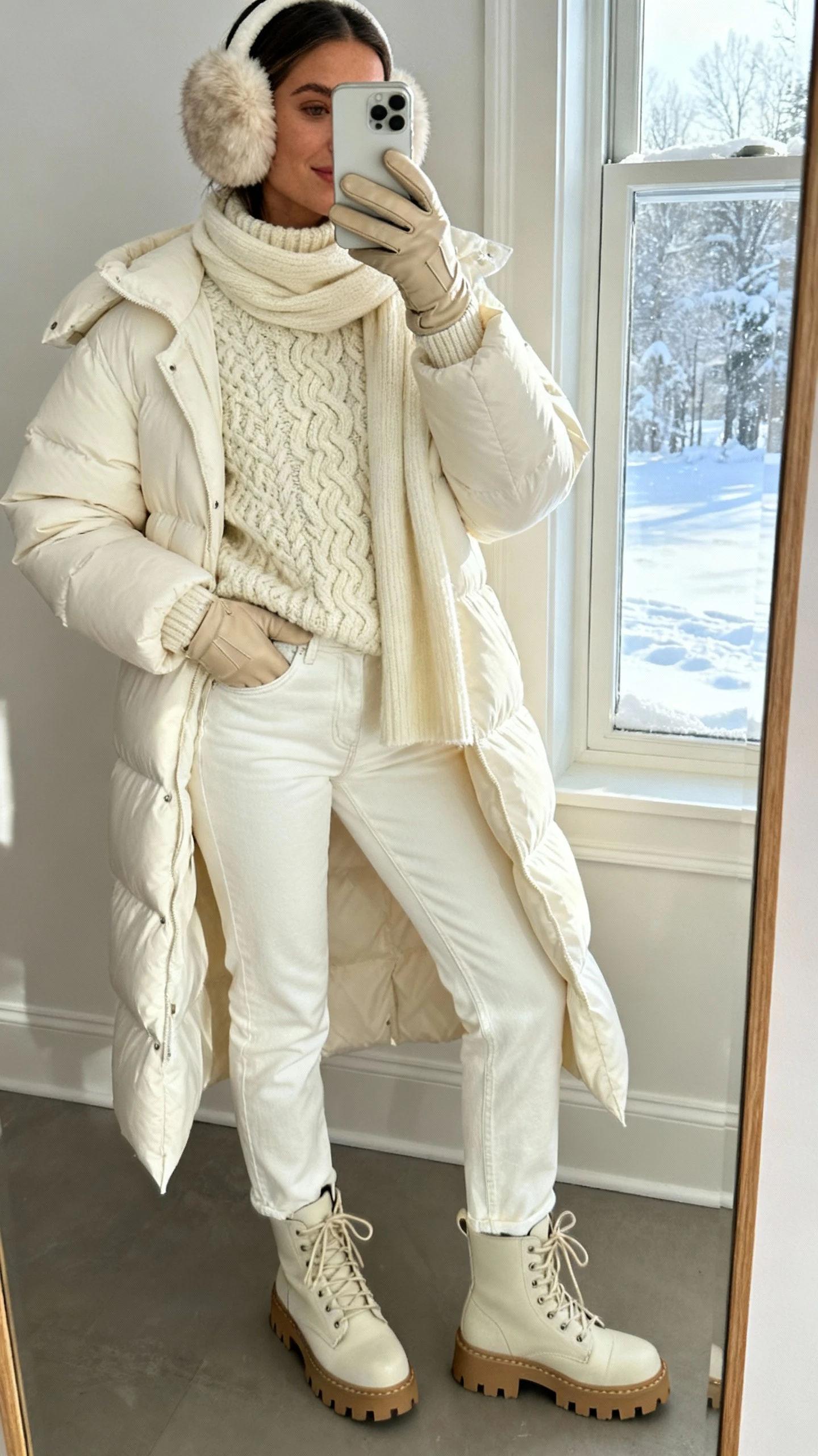 Ideal for sleigh rides, spa days, and scenic photo ops. If white feels high-maintenance, pivot to soft beige and sand tones. Add a statement faux-fur scarf for red-carpet energy in the snow.