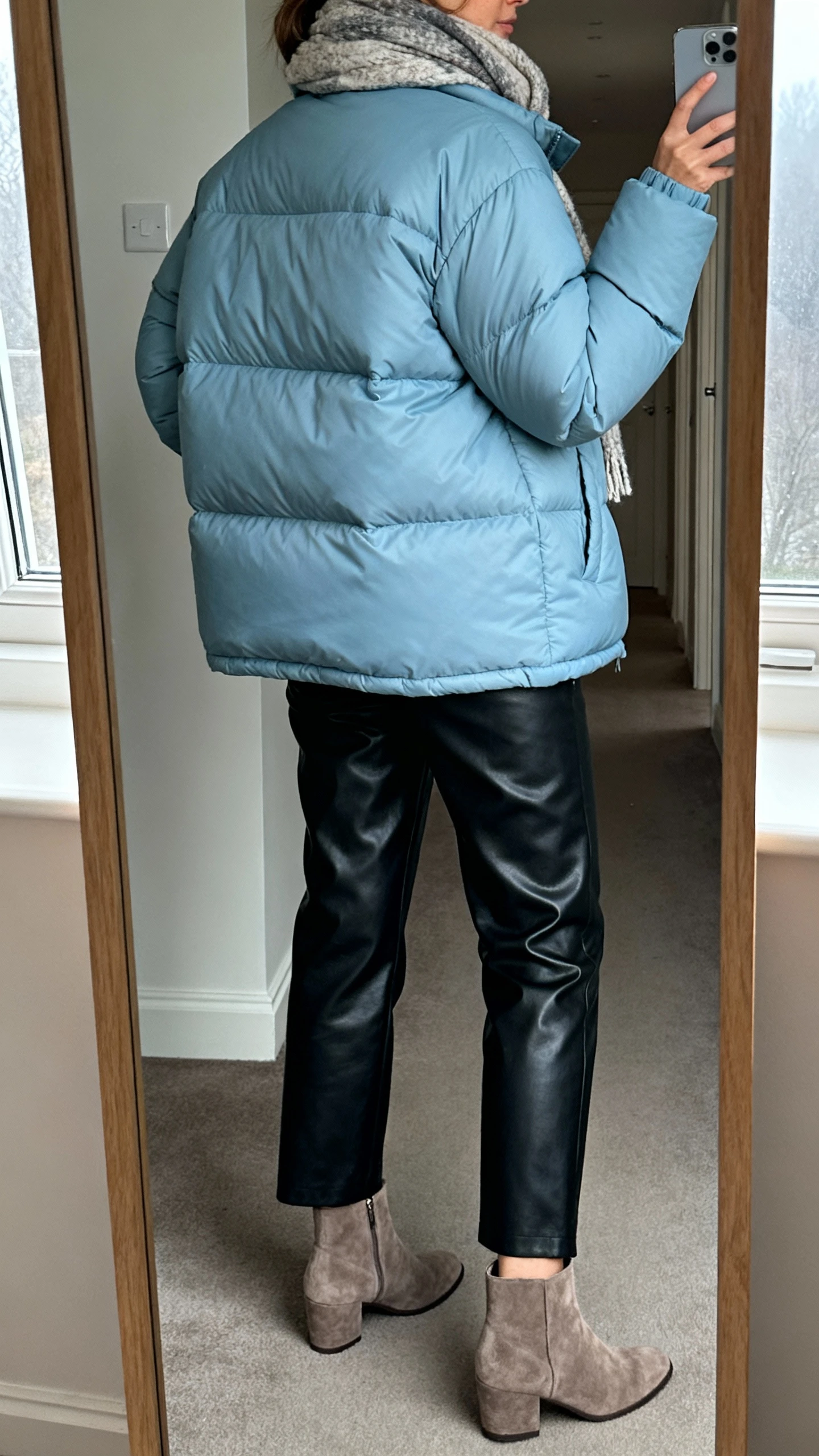 Outerwear can make casual outfits look premium. An icy blue puffer with leather leggings or coated denim gives you cozy-meets-upscale vibes. Add suede and sleek sunglasses for street-style energy that still feels wearable.