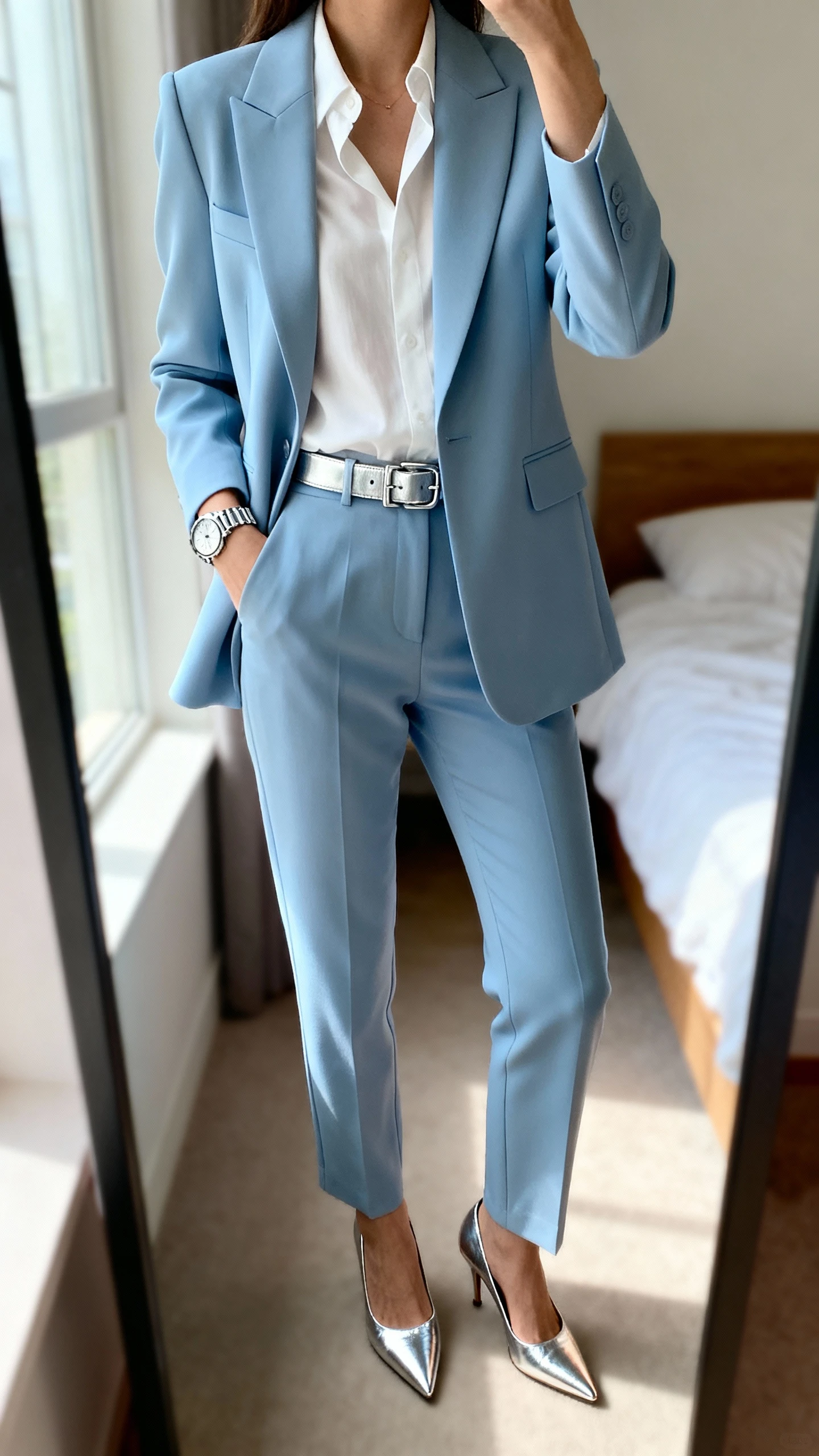 - Icy blue high-waisted trousers (fluid fabric, wide or straight leg)