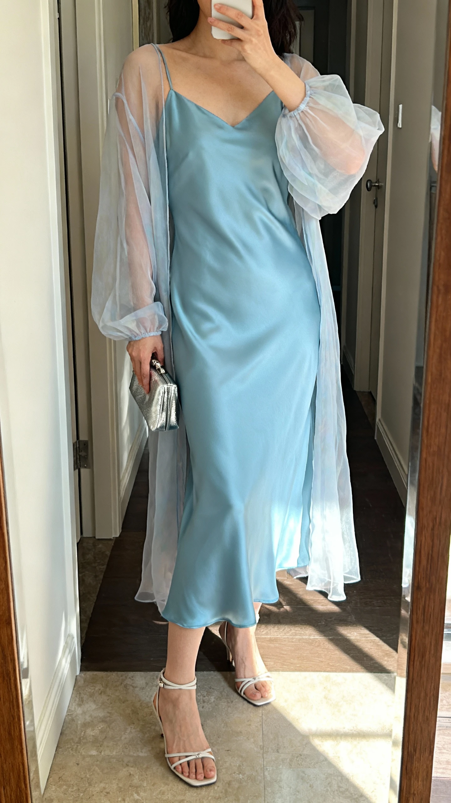 - Icy blue satin slip dress (midi length)
