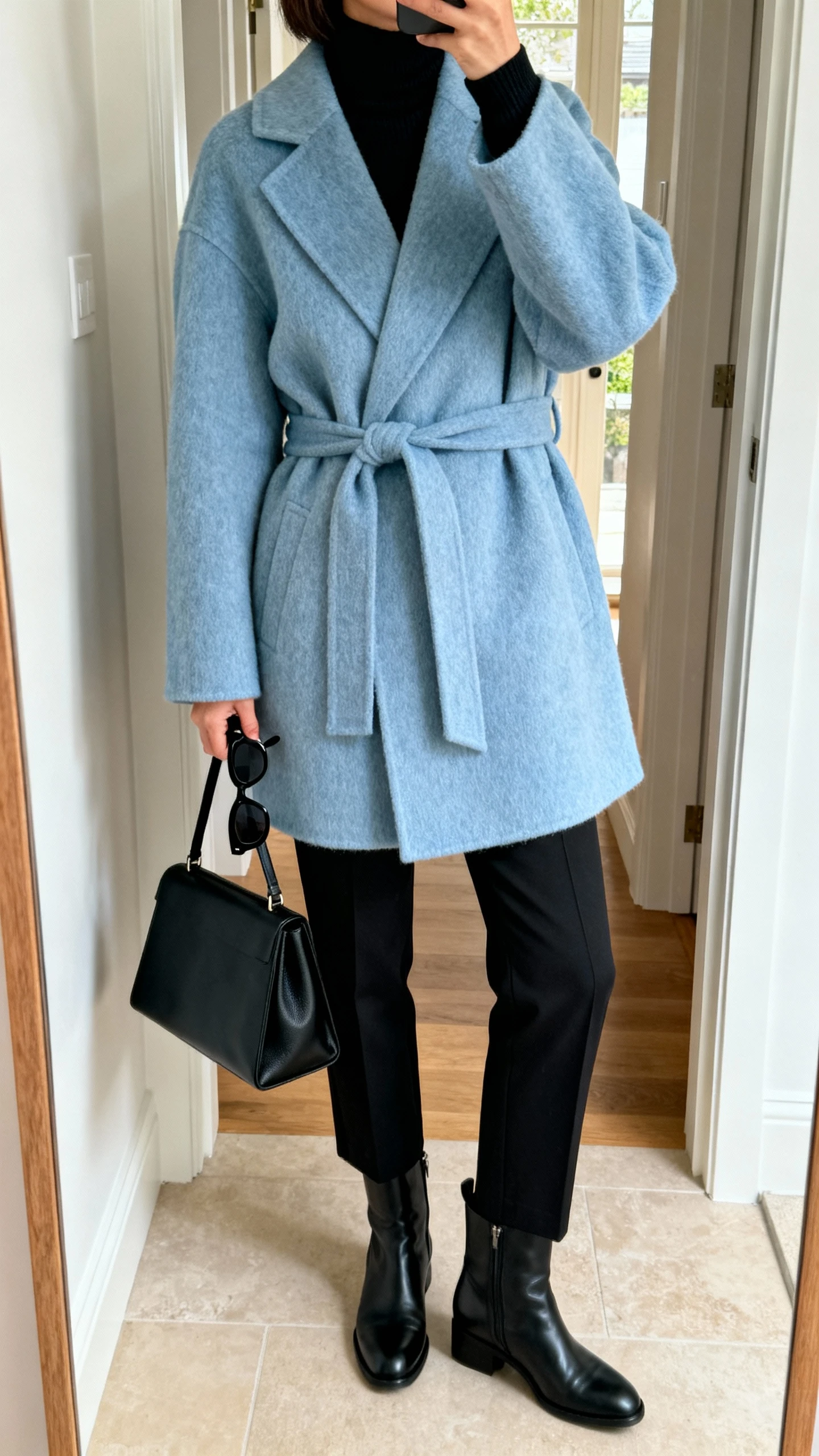 A standout coat will do more for your wardrobe than almost anything else. Throw an icy blue wool coat over all-black basics, and suddenly you look editorial. The contrast is crisp, dramatic, and super wearable.